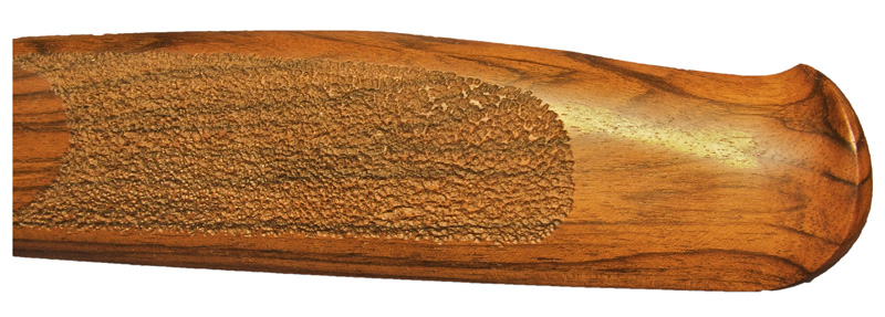 The stippling on the forend has been done with the same stippling that is on the grips (no border). It is quite plain and utilitarian. The original forend was missing, and the owner wanted a new one with a Schnabel.