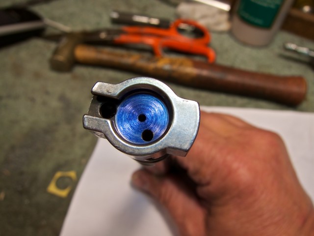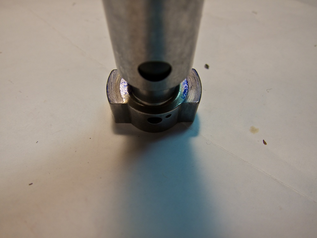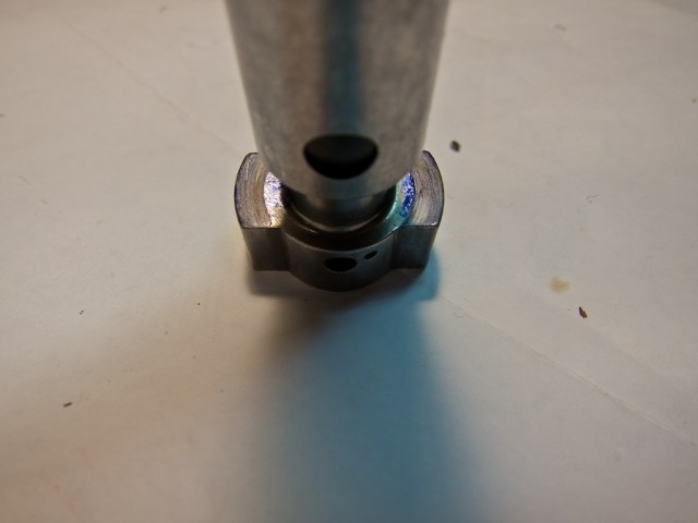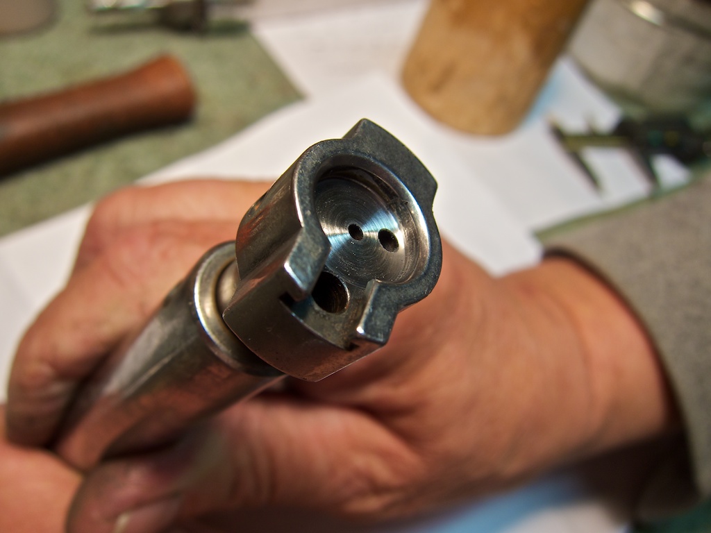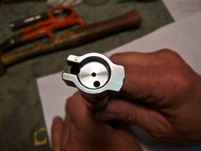 Even though this is a floating bolt head, it is still necessary to true the bolt head. After lapping the lugs and bolt face, notice that the Savage dimple is gone. This should slow down ‘blowing or blanking’ primers.