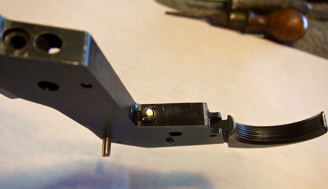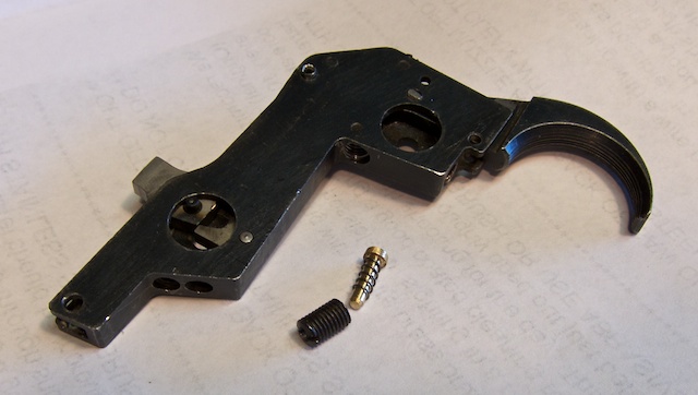 This is a trigger out of a 37 Remington. I believe that there were two different triggers, although I’ve only seen one of them. I don’t know whether this is an accessory trigger, or the other Remington trigger. The problem is that this trigger had several missing pieces, and had no adjustment for trigger weight any longer. I came up with this plunger and spring, which fills the space and also works by increasing trigger pull. Can anyone identify it?
