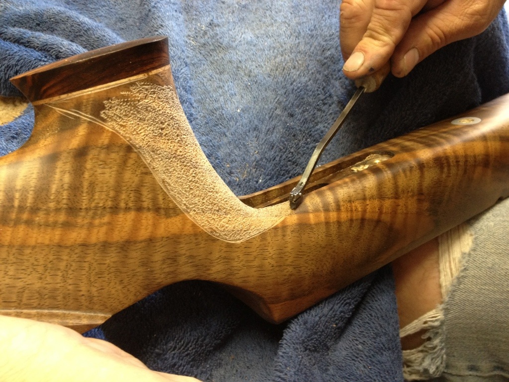 Stippling and outlining a Claro Walnut stock with fiddleback