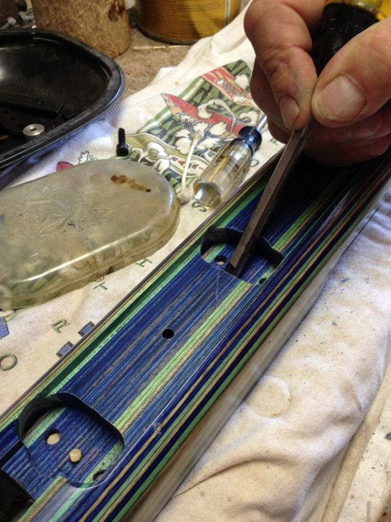 The reason for the wood chisel is to scrape the finish off to get a good bond between the bedding compound and the wood. 2000 Anschutz are extremely thin in the area of the action screws.