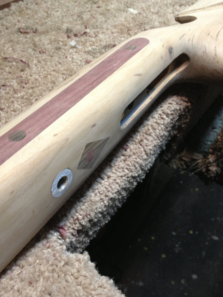 Inlay is Purple Heart inlaid with English Walnut plugs. The pistol grip and the diamonds are English walnut inlaid with purple heart. The original stock is some sort of Maple.