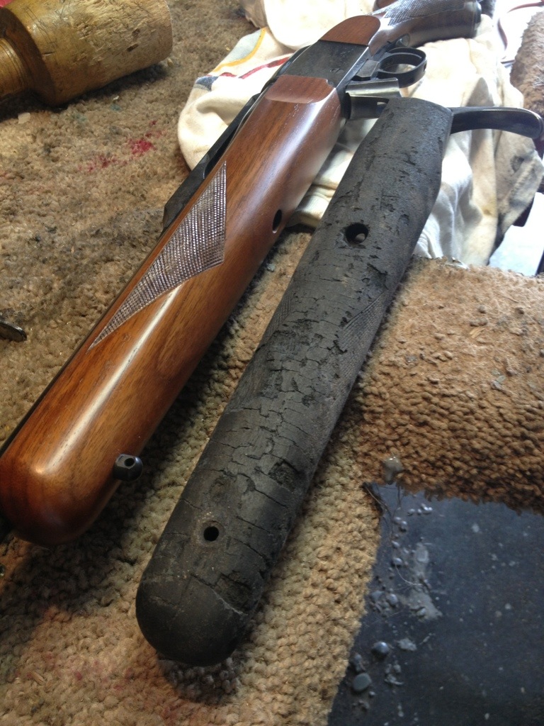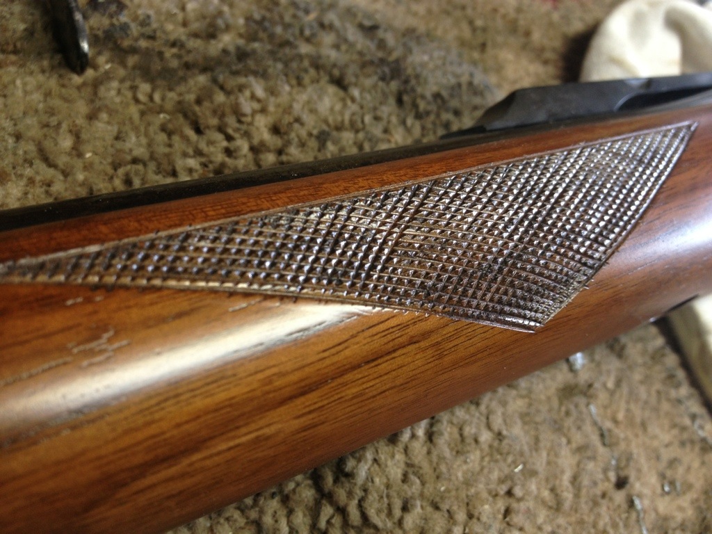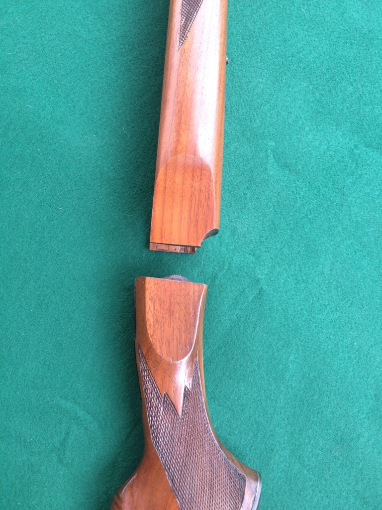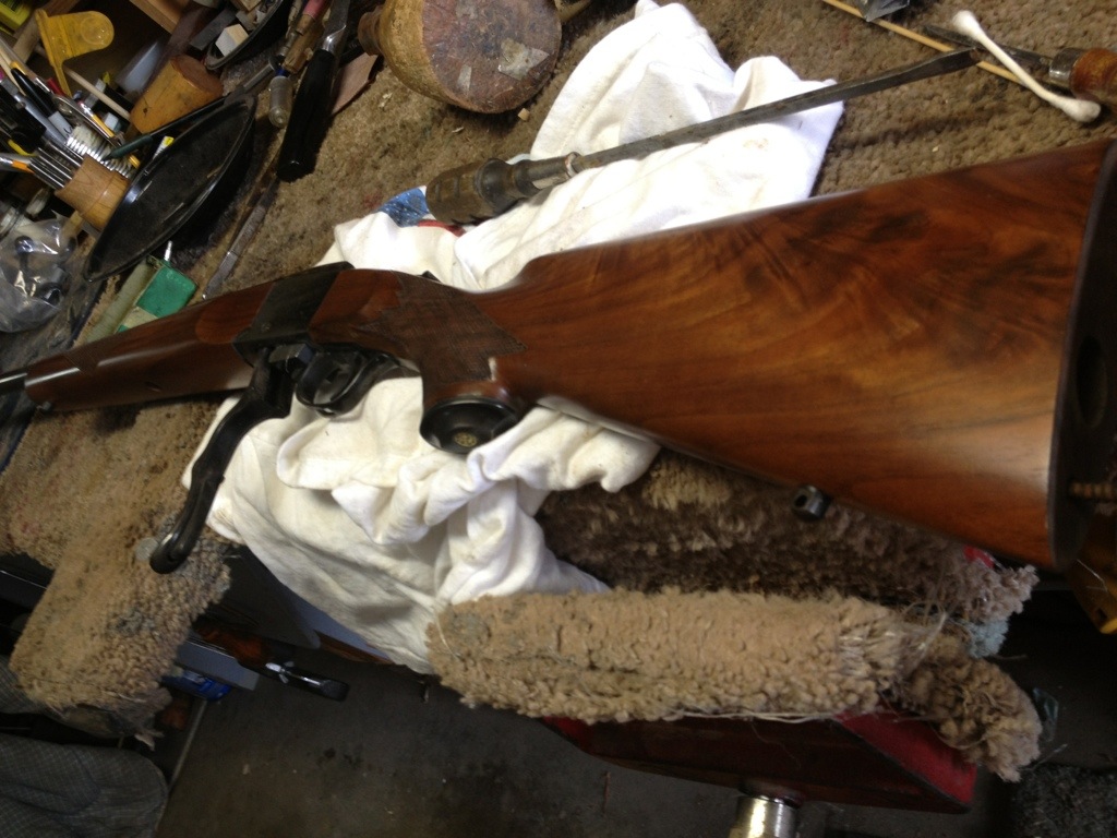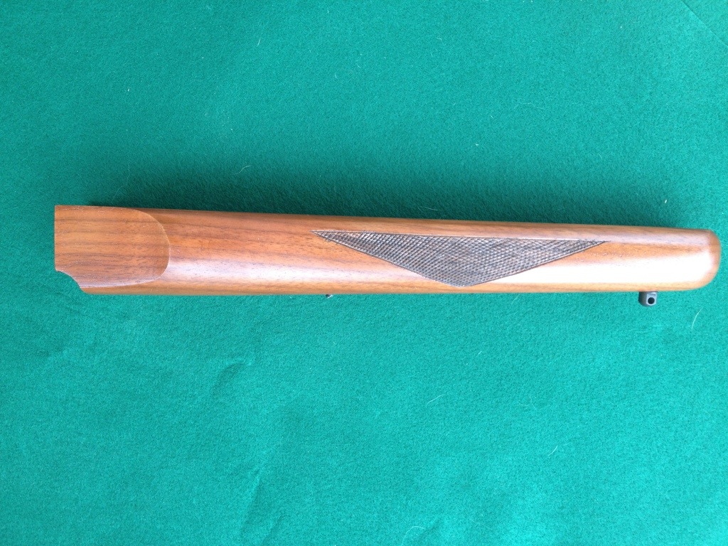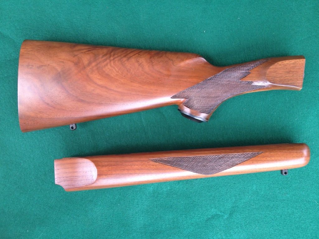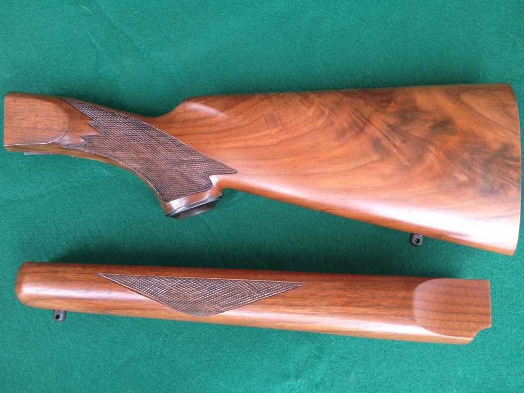This is the completed forend and stock for a a #1 Ruger. The forend was so damaged in a fire that it could not be used; however, the stock was functional. I made a complete new forend and refinished the stock and re-cut the checkering.