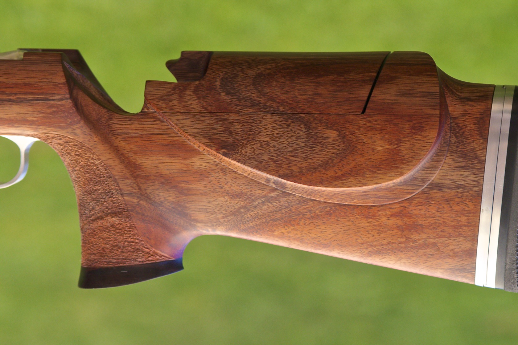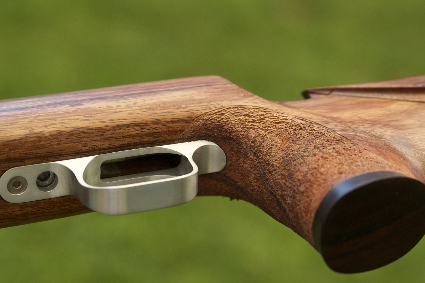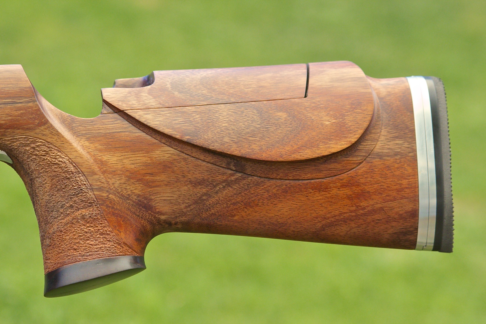Finished stock. Note the adjustable cheekpiece as a space / gap at the rear of the stock. The allows the shooter to adjust heel and toe without binding between the cheekpiece andt he stock. The Koa is a Hawaiian wood. It has been curing in my shop for 2-3 years, just waiting for the right time to become a stock.