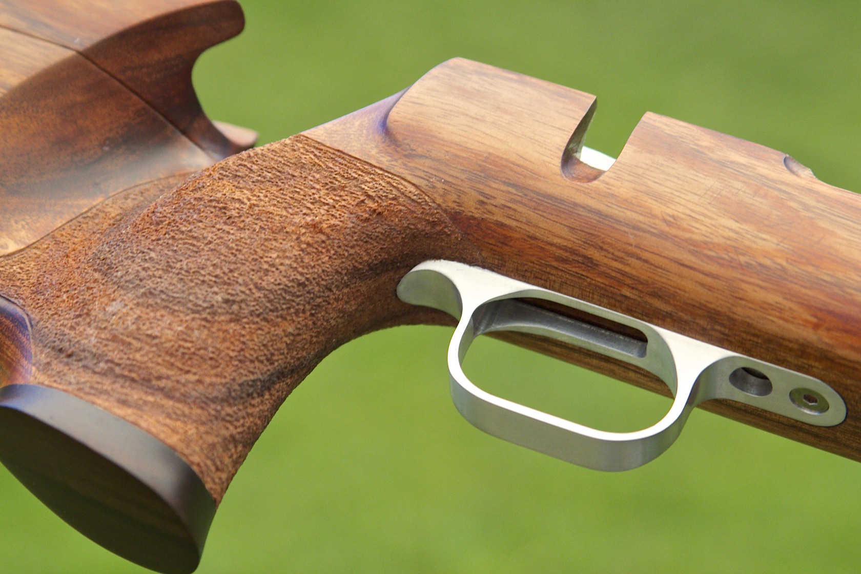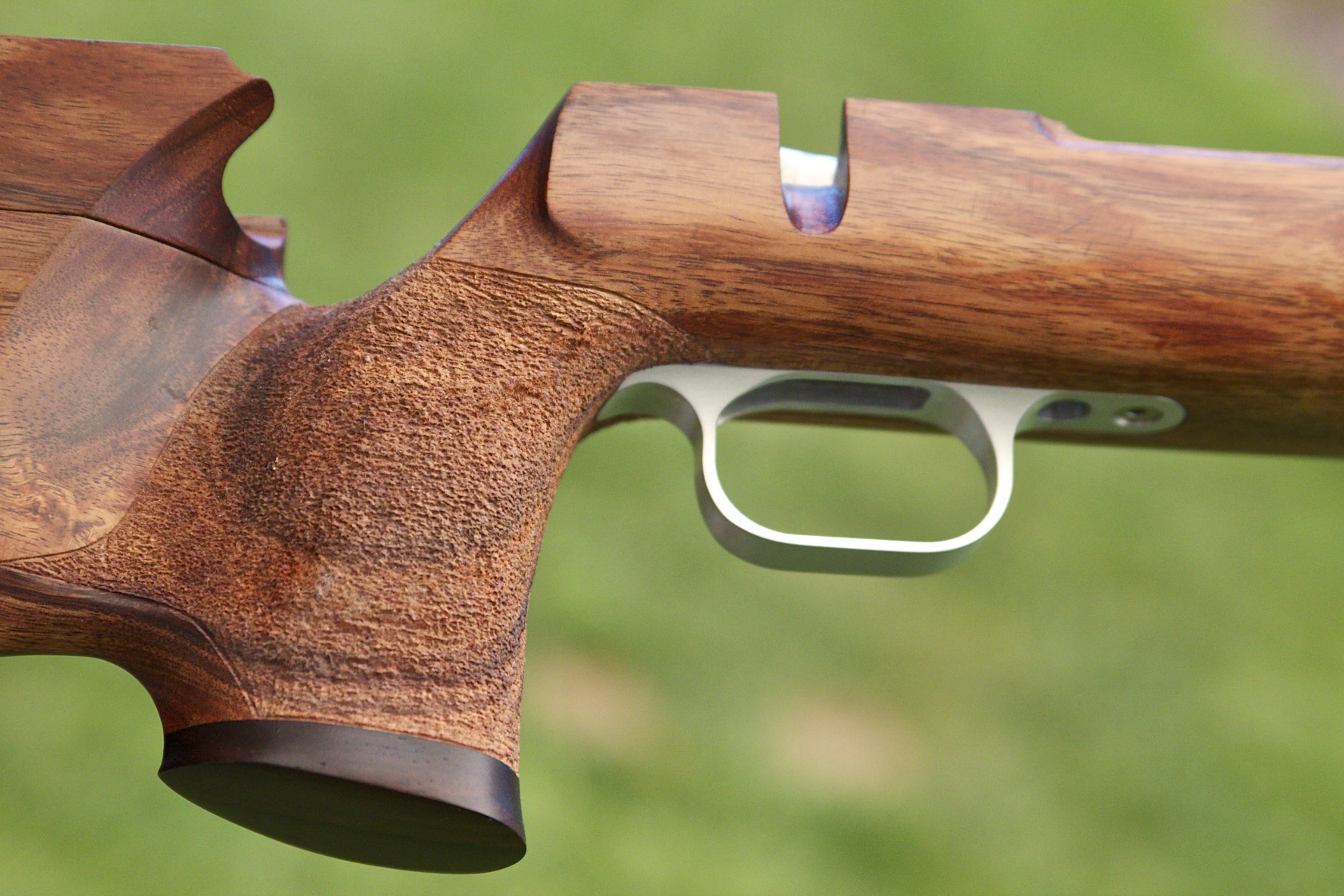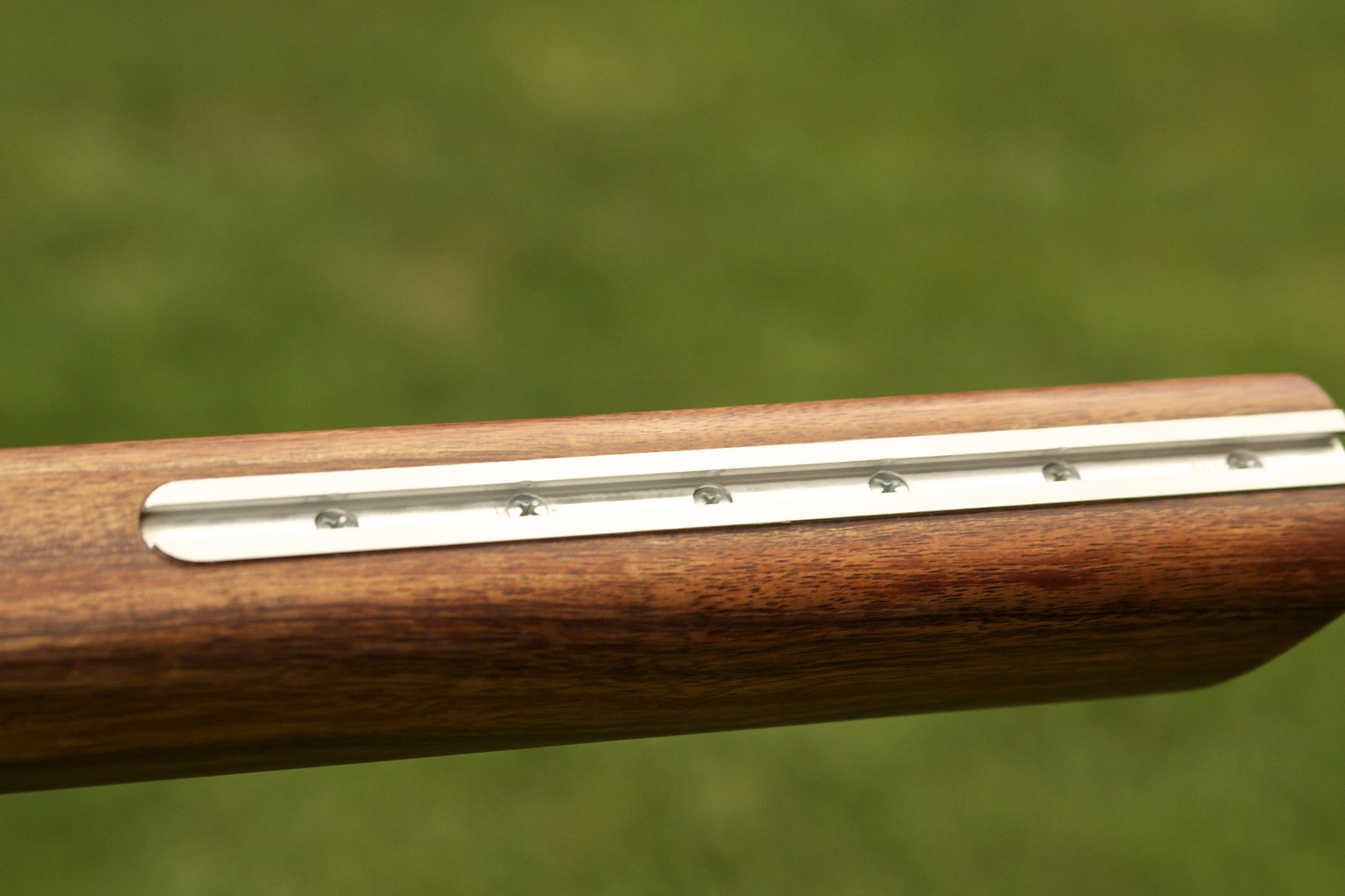 Finished stock. Note the adjustable cheekpiece as a space / gap at the rear of the stock. The allows the shooter to adjust heel and toe without binding between the cheekpiece andt he stock. The Koa is a Hawaiian wood. It has been curing in my shop for 2-3 years, just waiting for the right time to become a stock.