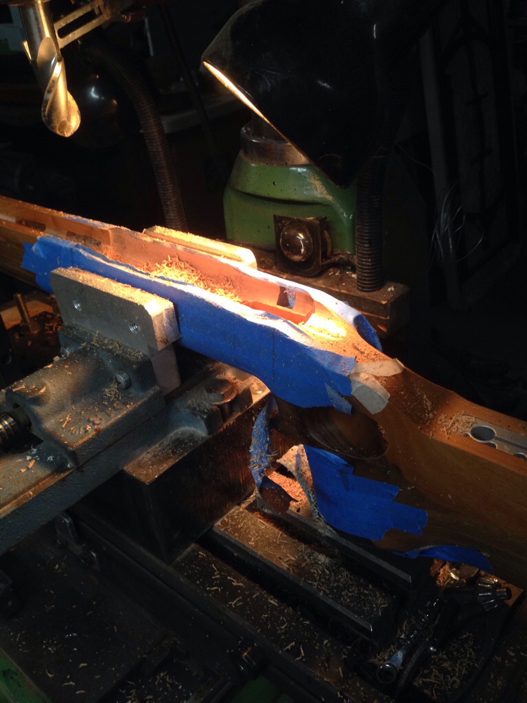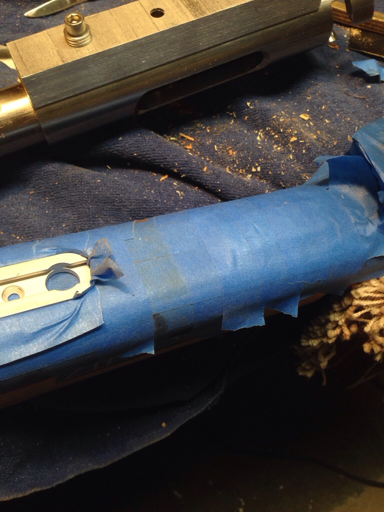 This project is a real challenge, as the stock comes already finished. I have tried to keep it as original as possible with no markings. This is not a stainless steel action, but a Barnard action that I am using for markup. It is an unfinished, demised action.