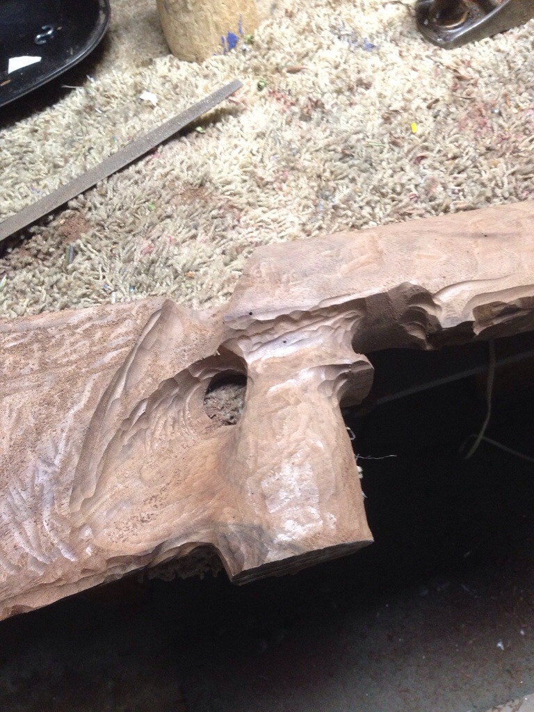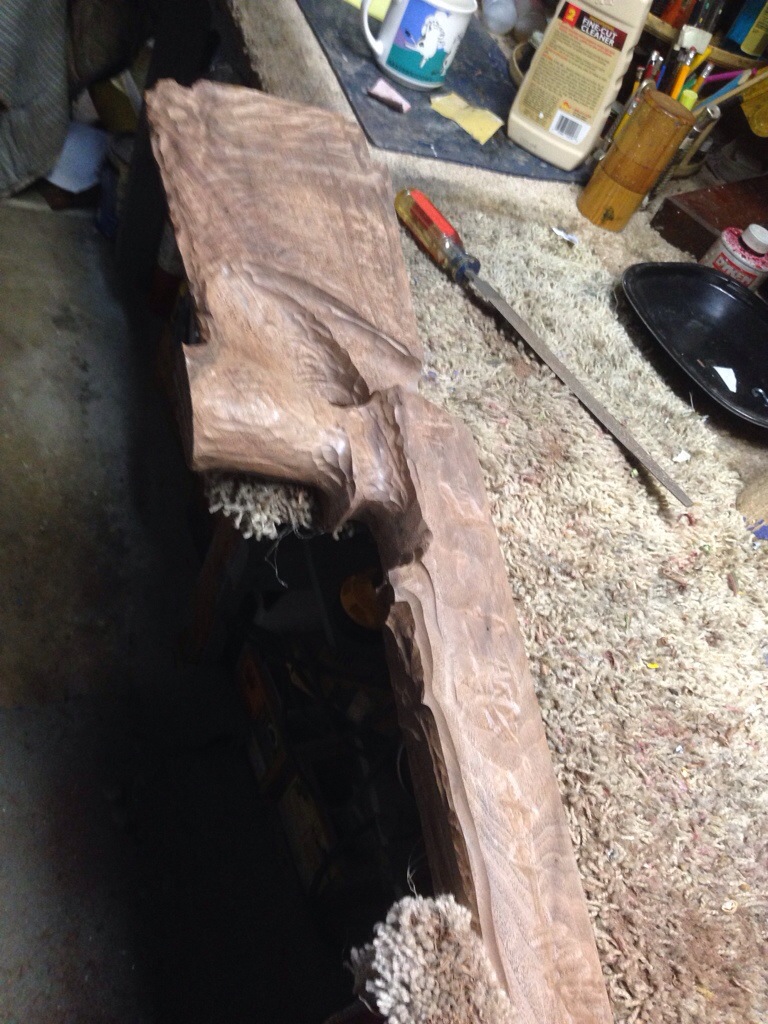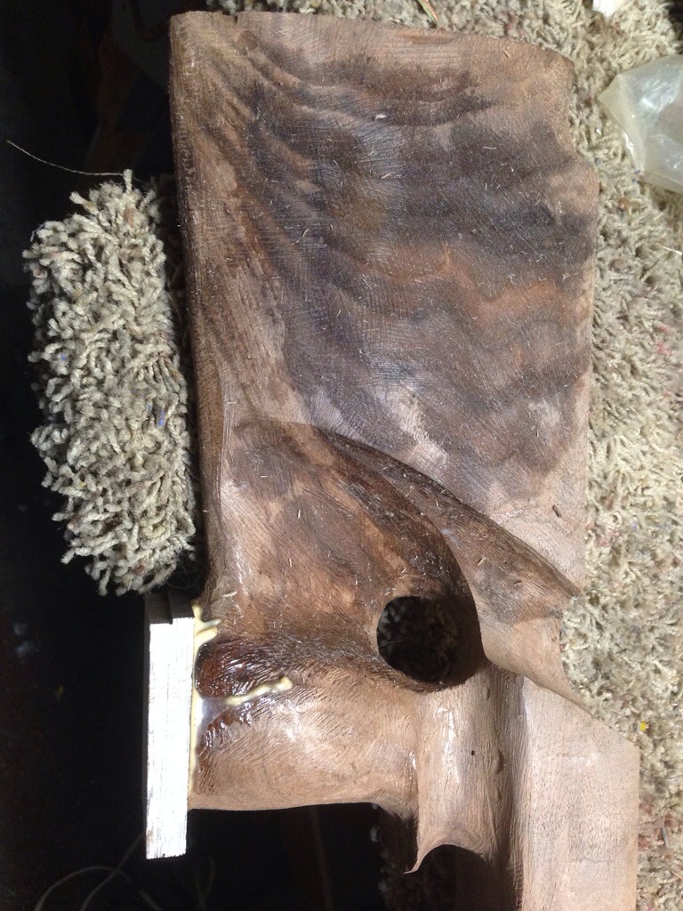 These four pictures show the progression from duplicator to rough rasping of the pistol grip and adding a Rosewood pistol grip cap. The dark areas will show the color of the finished wood. Picture #4 is the Rosewood pistol grip cap.