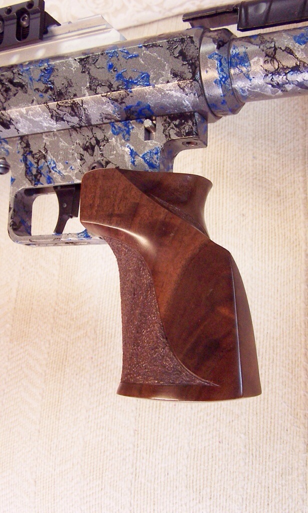 This is a grip that I made for an Eliseo stock. Photos sent in by a customer. Note that I changed the angle on the thumb rest for him. Air Force colors on the stock.