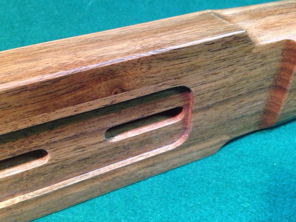 Note the FTR rail for bipod and bottom ventilation. Extra wood was added for 3 inch fore end. The wood match came out quite well. Additional wood needs to be added to get the 3 inch Foreende because most of the blanks are 2 1/2 inches and matching the wood is a real problem, or you need to make a feature out of the matching pieces of wood.