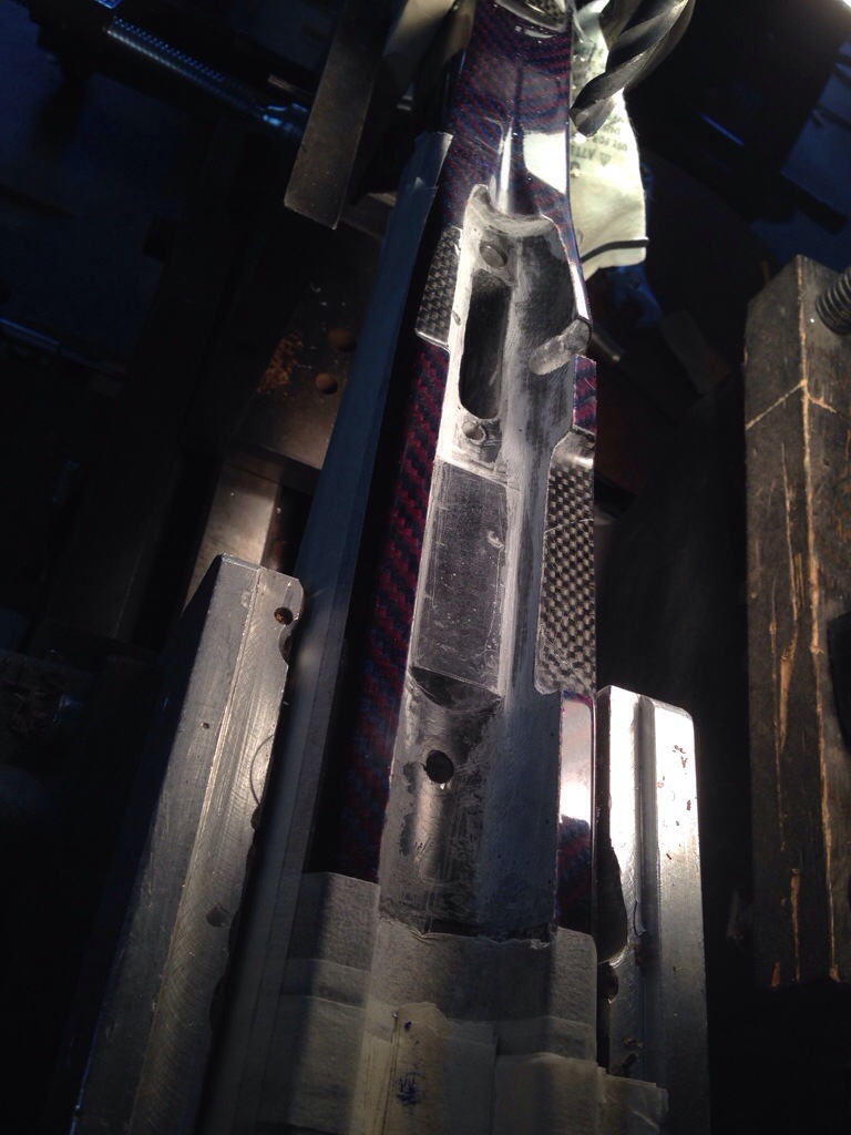 A number of years ago I made some fiberglass and polyester resin stocks with balsa wood cores. They finished out at approximately 11 to 12 ounces. Because the stocks were so light, you could still use the inch and a quarter barrel and make the light weight requirement; but needless to say they changed the rules. The workmanship on this carbon fiber stock and the shape of the stock is outstanding, but there are some limitations with the interior. The balsa wood is fine. The stock has a red Cedar core, which can be sensitive when you glue a pillar into it with very little surface area. The reason is because red Cedar has its own natural oils, which is why they make red cedar shingles to repel water and bugs, and last for years.. If a piece of instrument grade spruce was used for this, similar to the spruce that I use in my FT/r stocks, this might be a better solution. Spruce lends itself to almost every type of glue available and is more rigid. Countless number of airplanes have been built from Spruce including the Spruce Goose. The following pictures depict what I did to solve some of the problems. I removed the red Cedar and replaced it with a pillarized bedding block. I added an adjustable buttplate that is adjustable for up-and-down and cast on cast off. The rifle still makes FT/R weight with an F / Open size barrel.