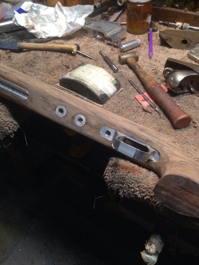 This is a nice piece of dark English walnut While working on the stock I noticed that there were some marks in the wood that I didn’t understand. When I machined the slot for the bolt relief in the cheekpiece it became very evident what the marks we