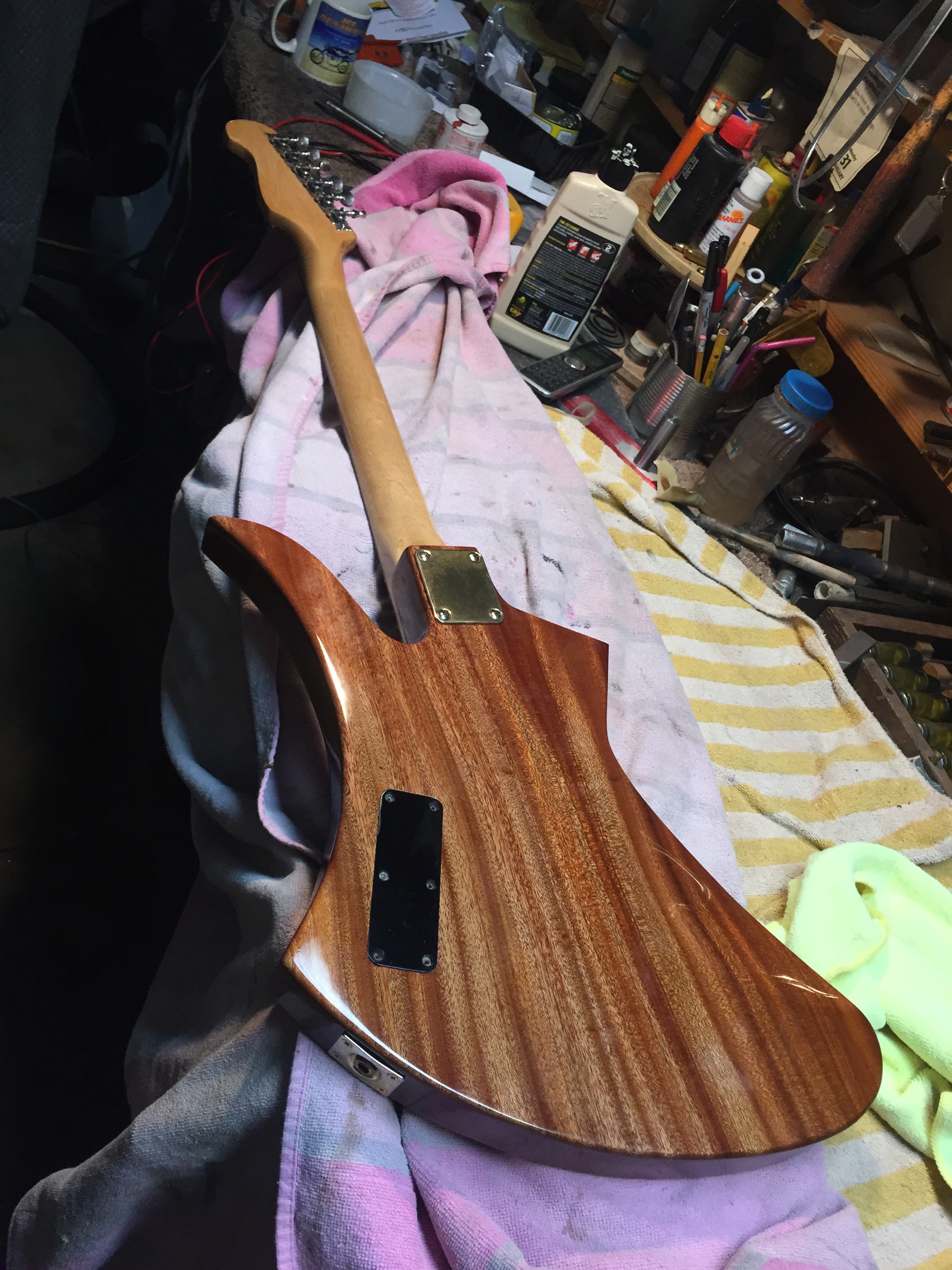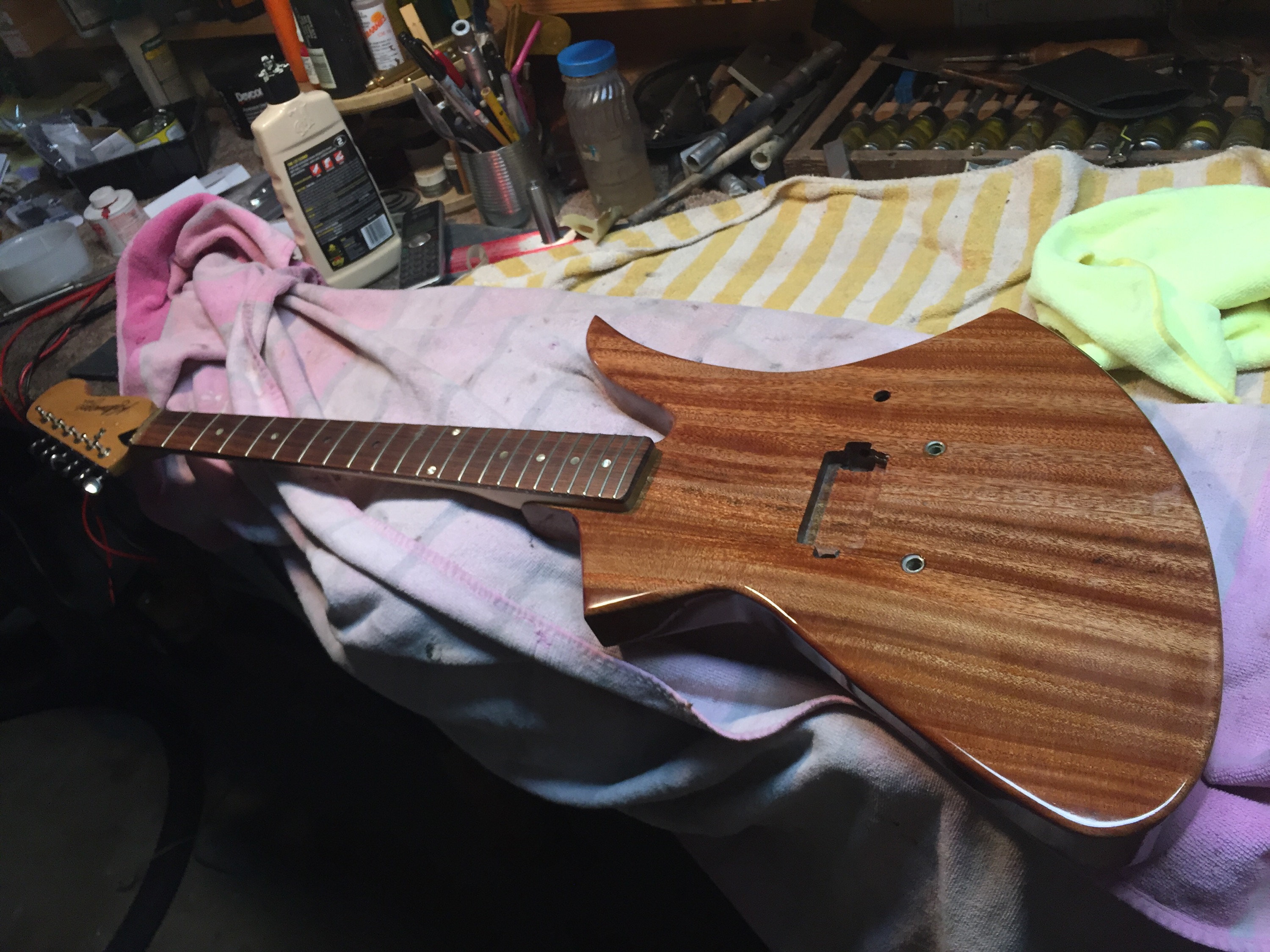 Humbucker pickup installed with wiring and volume control. The neck has been fitted, and the owner picked up the guitar, and he will install the strings and tune it. Concert to follow.