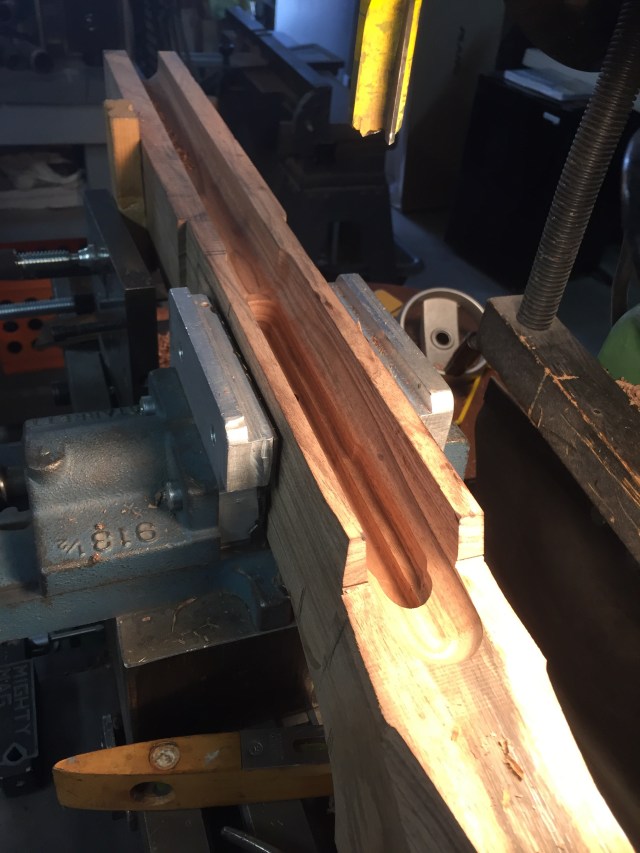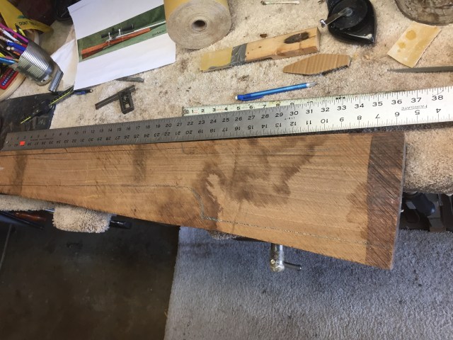 This will be a 22 Rimfire Bench Rifle. It will have Desert Ironwood accent pieces to make up the 3 inch forearm. It will be hand carved, similar to the turbo maple stock that I did several months ago. Lots of chips and carving. I've started the bedding so I can work from the center of the Rifle.