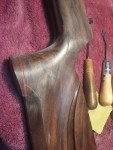 While working on the cheekpiece many burls (flowers) were revealed. Also, did some lightening on the forend, so that a heavier barrel could be used in the future.