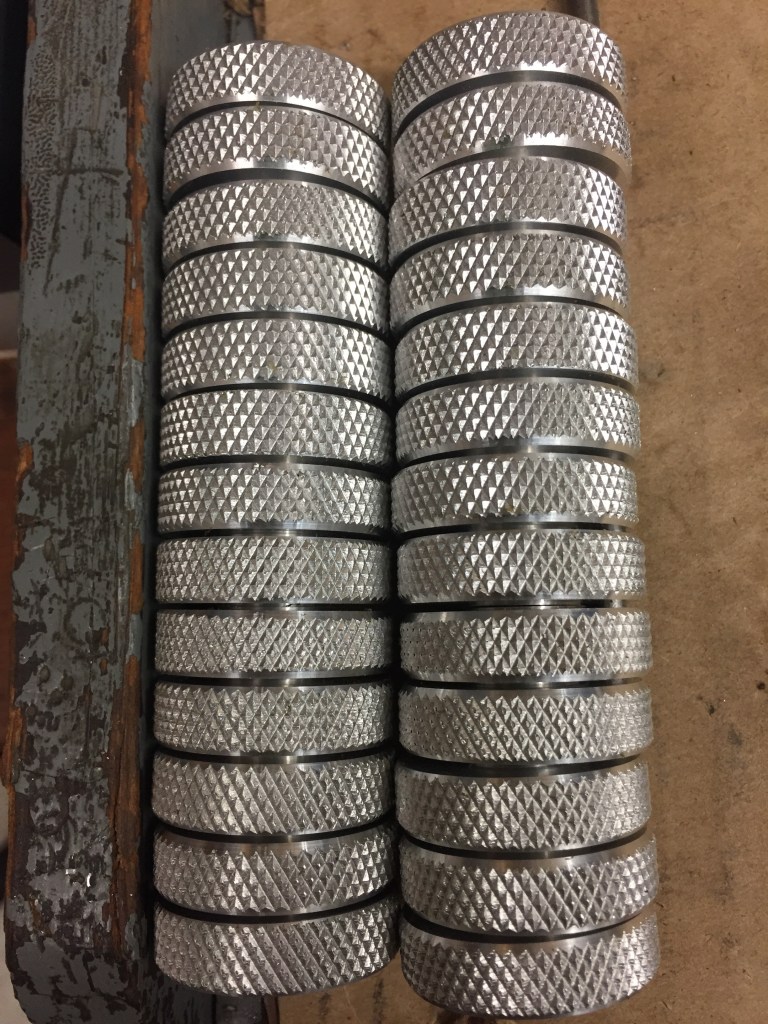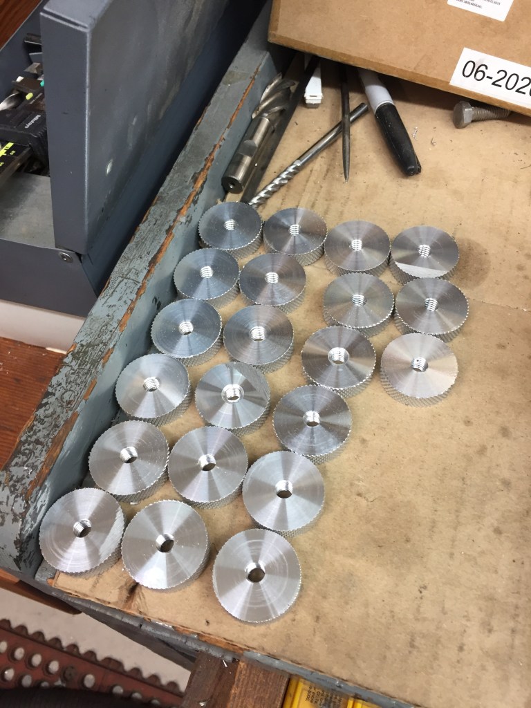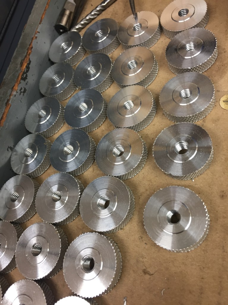 Taking a solid barstock, knurling, tappingand machining the thumb wheels into shape.
