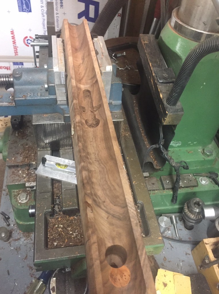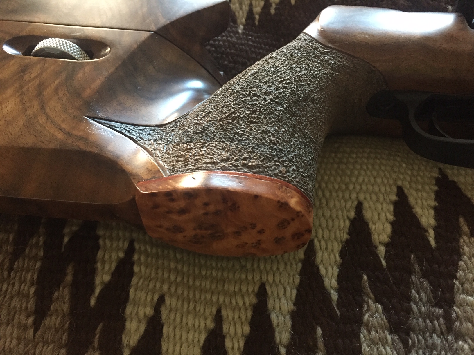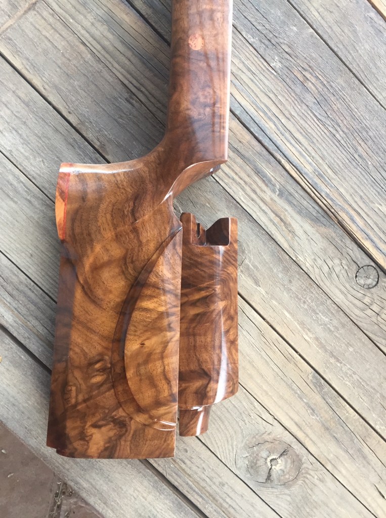This is a highly figured piece of English Walnut with burls and flowers. Along the bottom of the stock there’s a burl/flower that looks like an owl and one side looks like the Sandia Mountains.