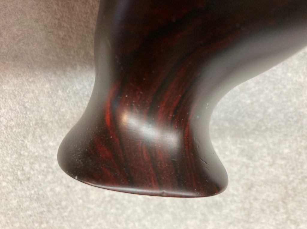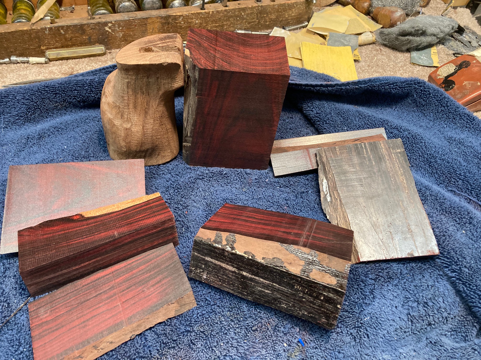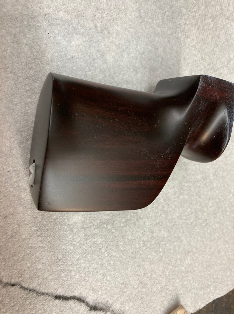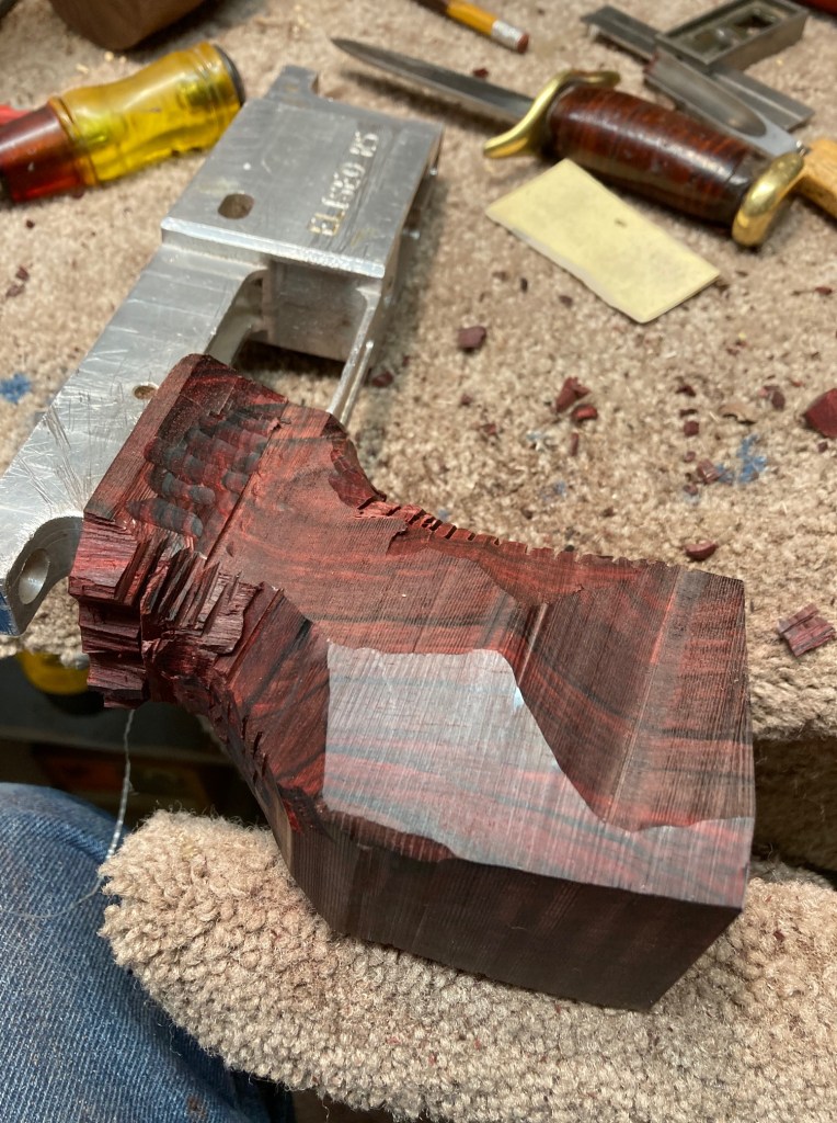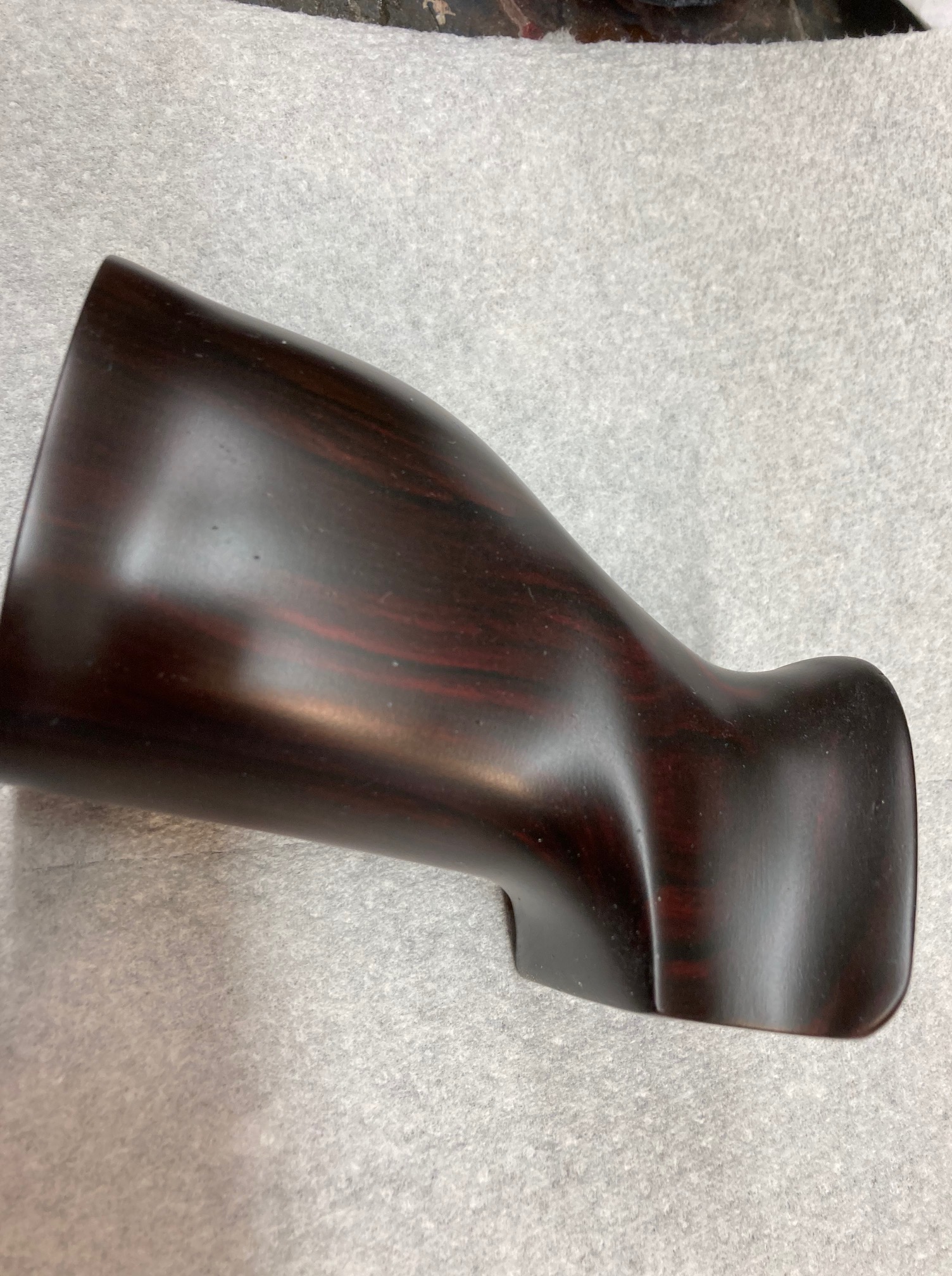 This grip was made from a block of Dalbergia Maritima. It is extreme dense, but easy to cut on the band saw. Works well with a #50 wood rasp and files. It’s sands well, but the dust sticks to everything and stains your hands. When finished with a satin finished it reminds me of a plum.