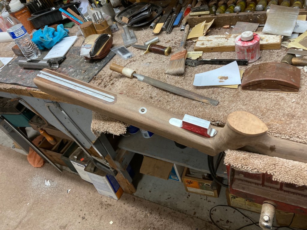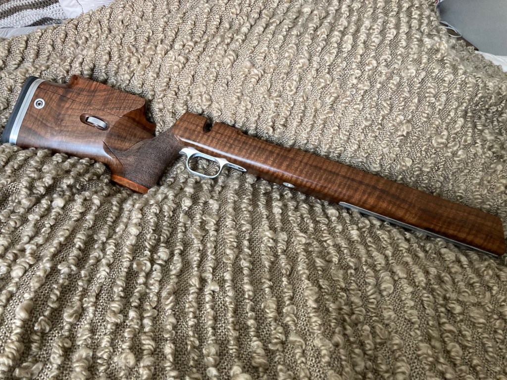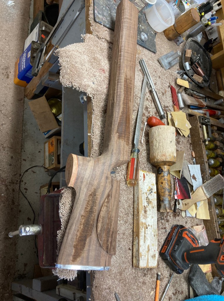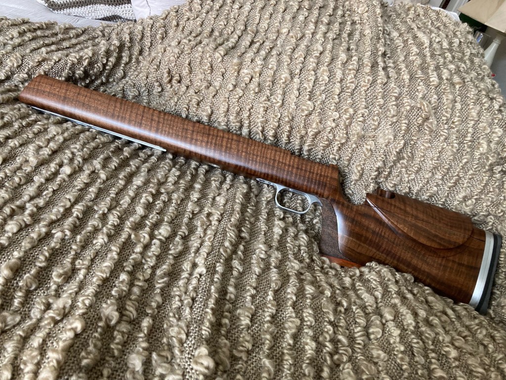 This is a piece of Claro Walnut with a lot of fiddleback for a Barnard Action. This will be used for long range with a sling.