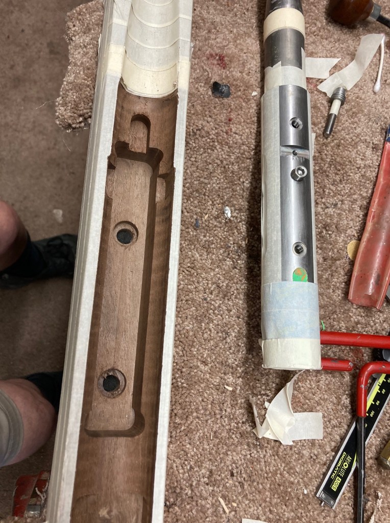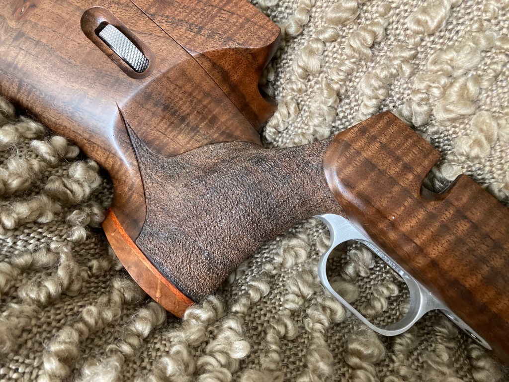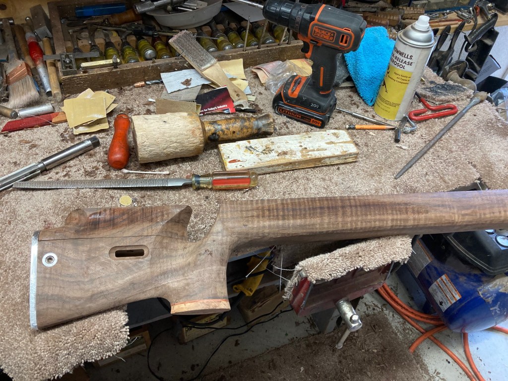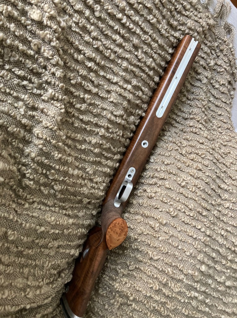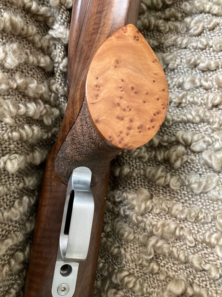 This is a piece of Claro Walnut with a lot of fiddleback for a Barnard Action. This will be used for long range with a sling.
