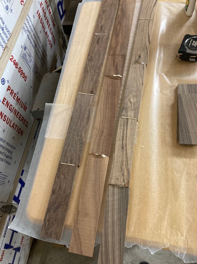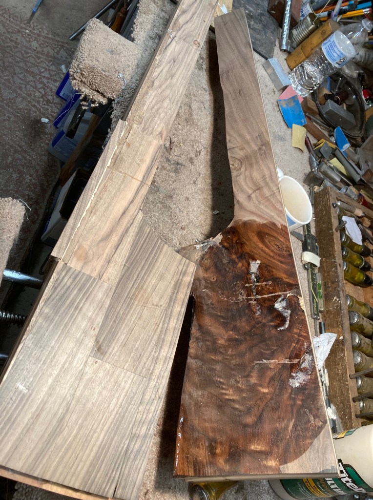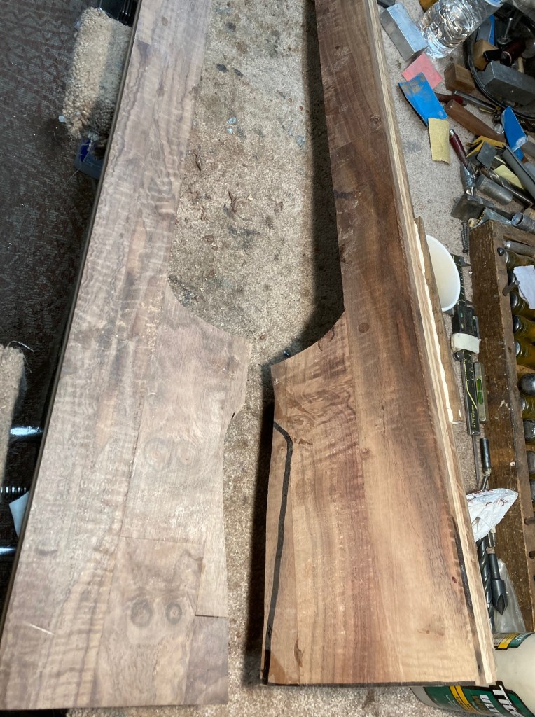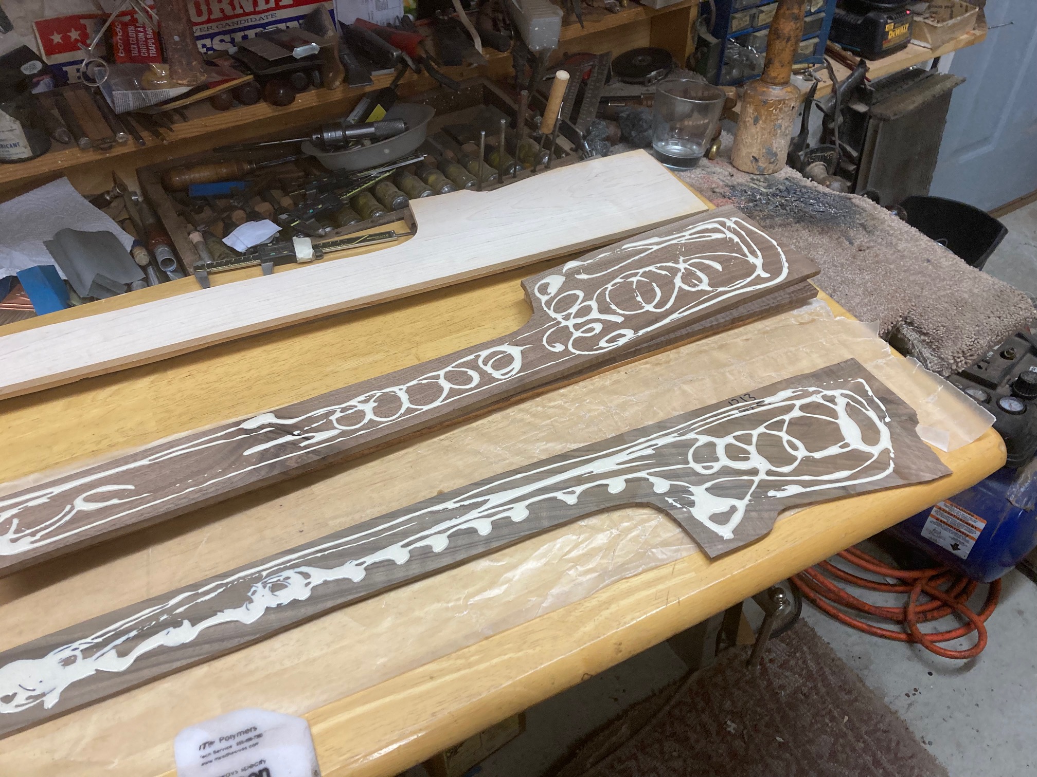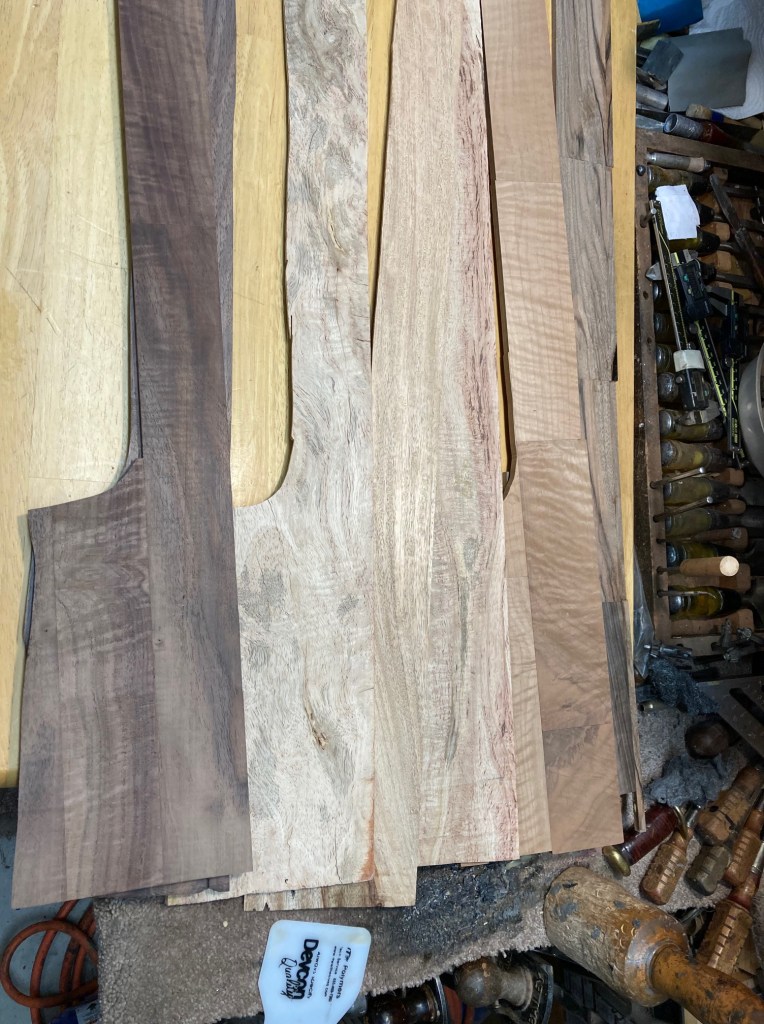 These are fancy flat pieces of wood from stocks I’ve done. It’s a mix of English Walnut, American Walnut, Koa, Mango, North American Walnut. The piece that I put water on was part of the USNRT Raffle Rifle.