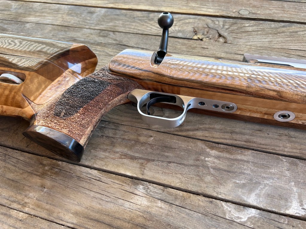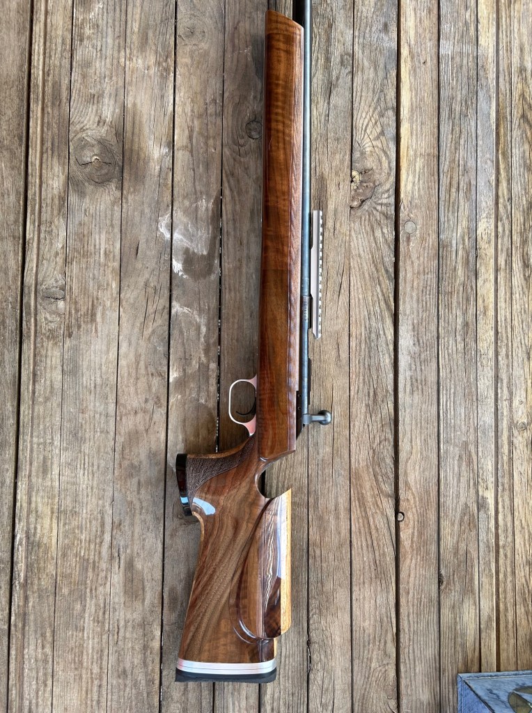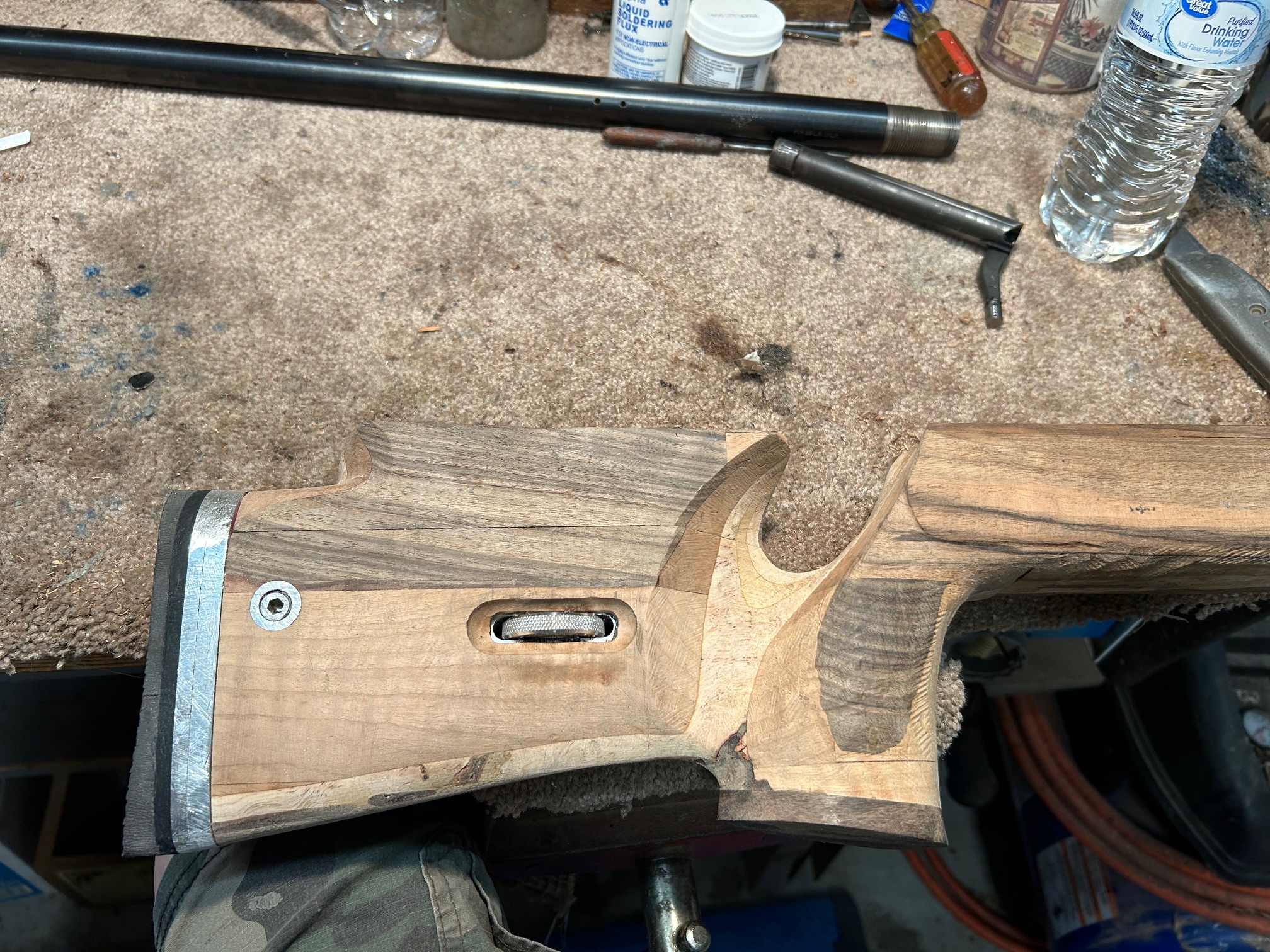 I did the bedding and made a special escutcheon for the rear tang. Also, put on a used Eric Johnson barrel, that appeared to be in excellent condition. What was interesting is the bore was .015″ off center Runout. Four Jawwed Chucks get heavier every year. The receiver and the trigger were like brand new, not broken-in at all. It’ll be interesting how it all works out.