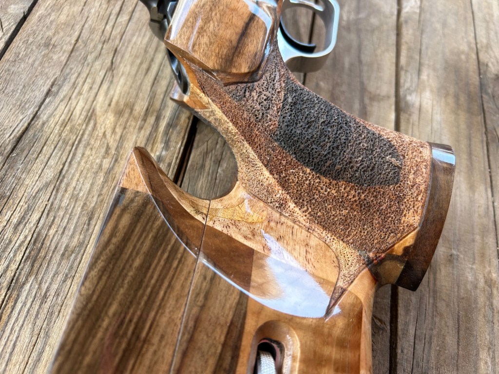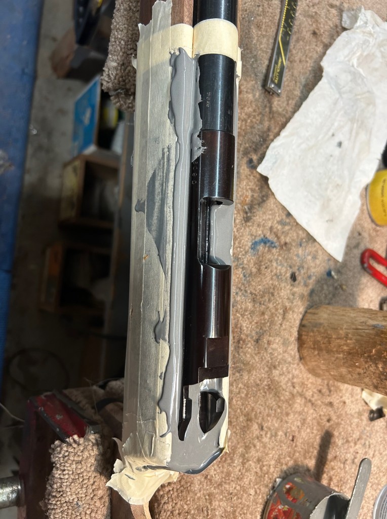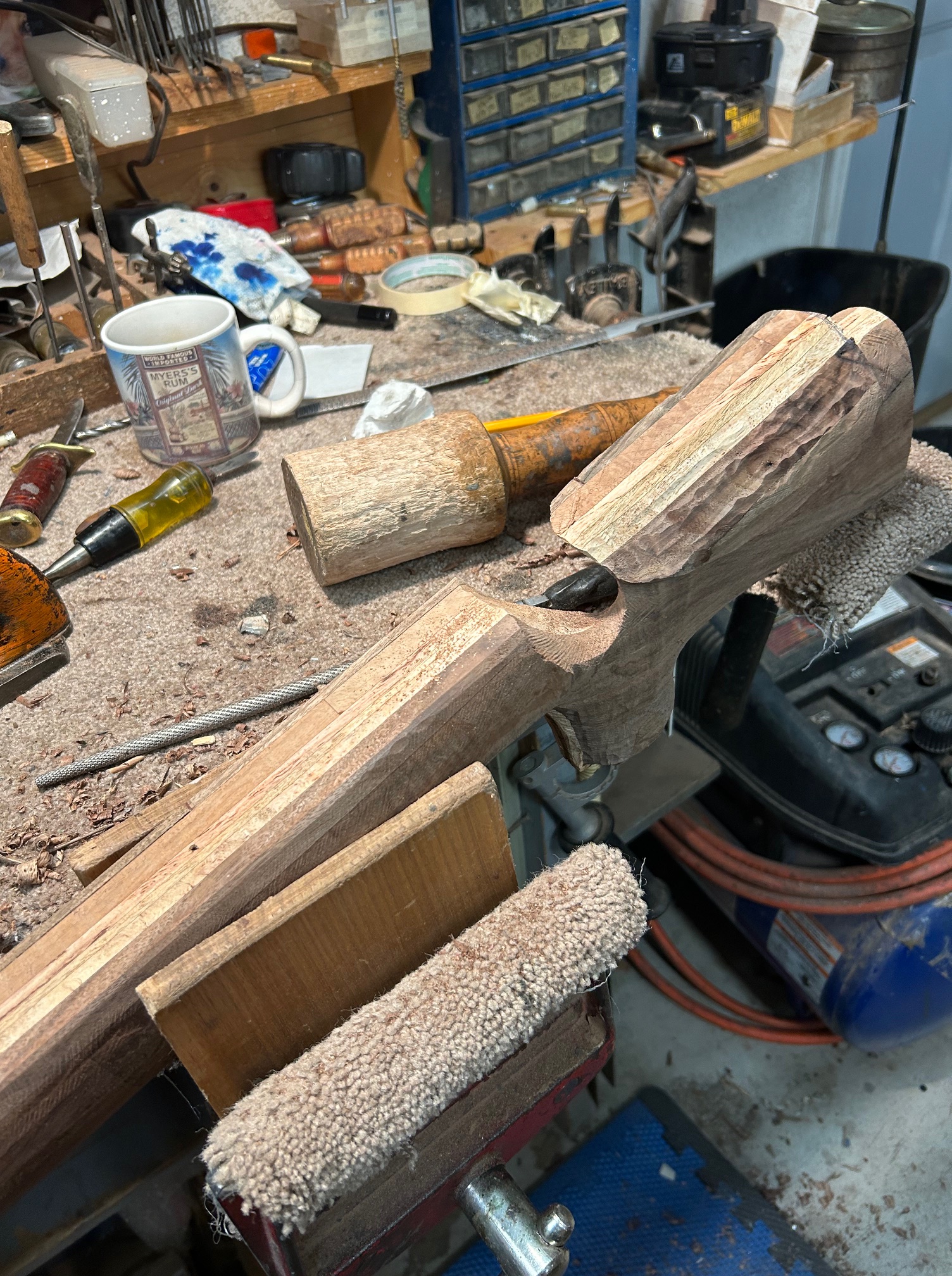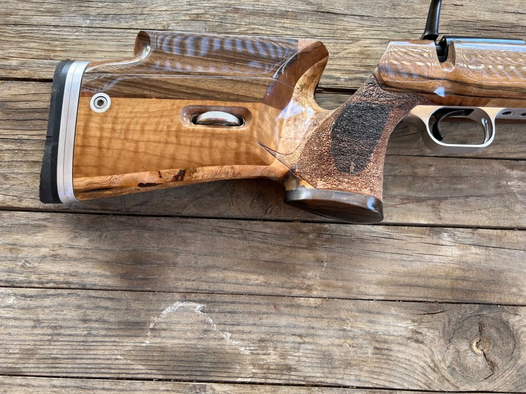 I did the bedding and made a special escutcheon for the rear tang. Also, put on a used Eric Johnson barrel, that appeared to be in excellent condition. What was interesting is the bore was .015″ off center Runout. Four Jawwed Chucks get heavier every year. The receiver and the trigger were like brand new, not broken-in at all. It’ll be interesting how it all works out.