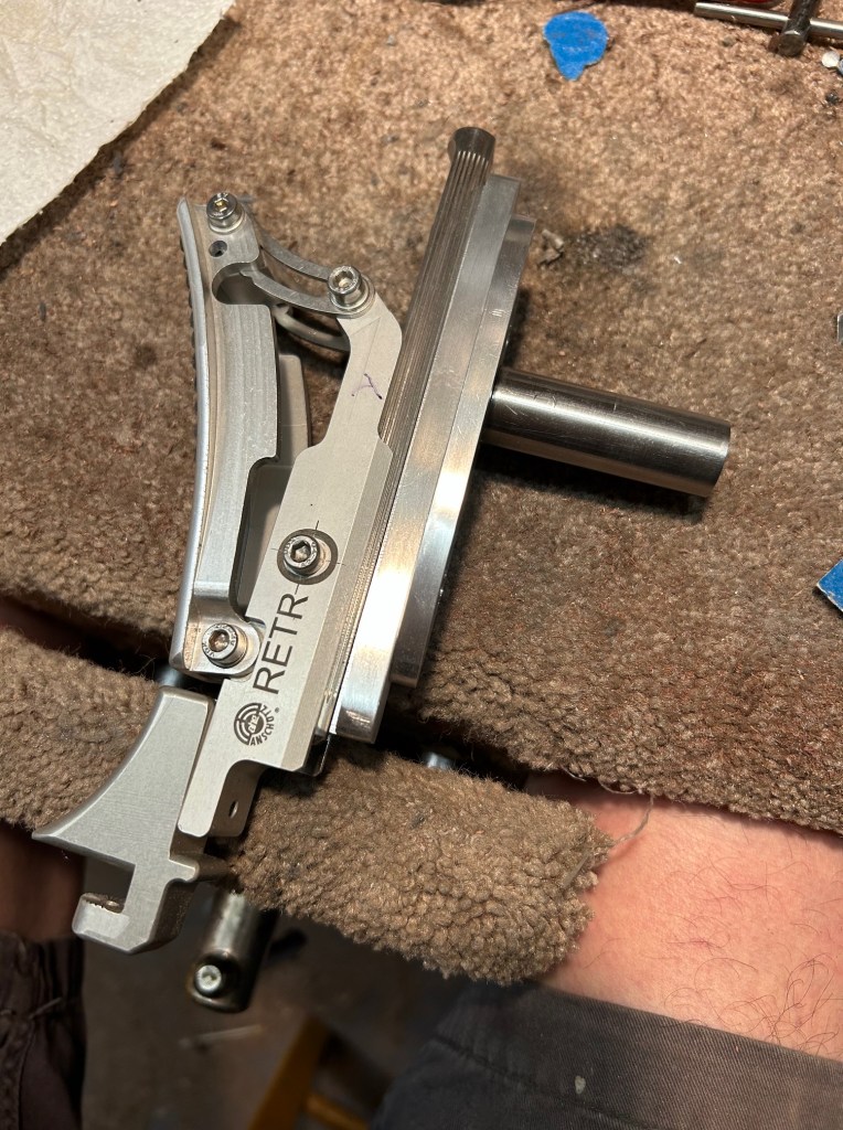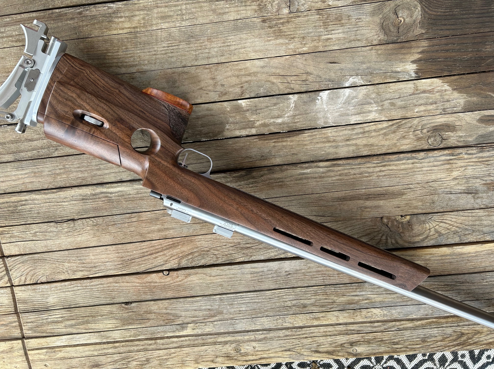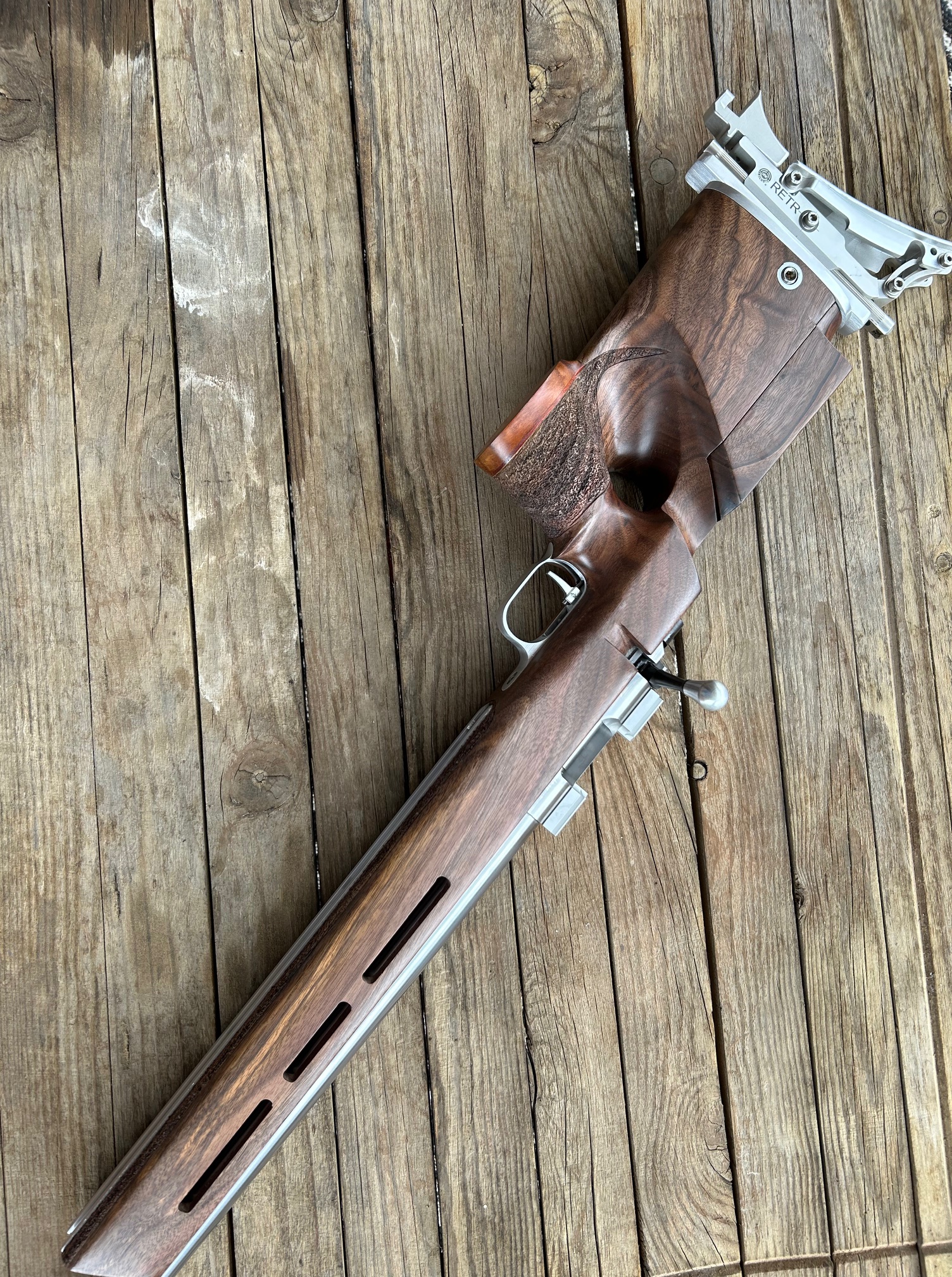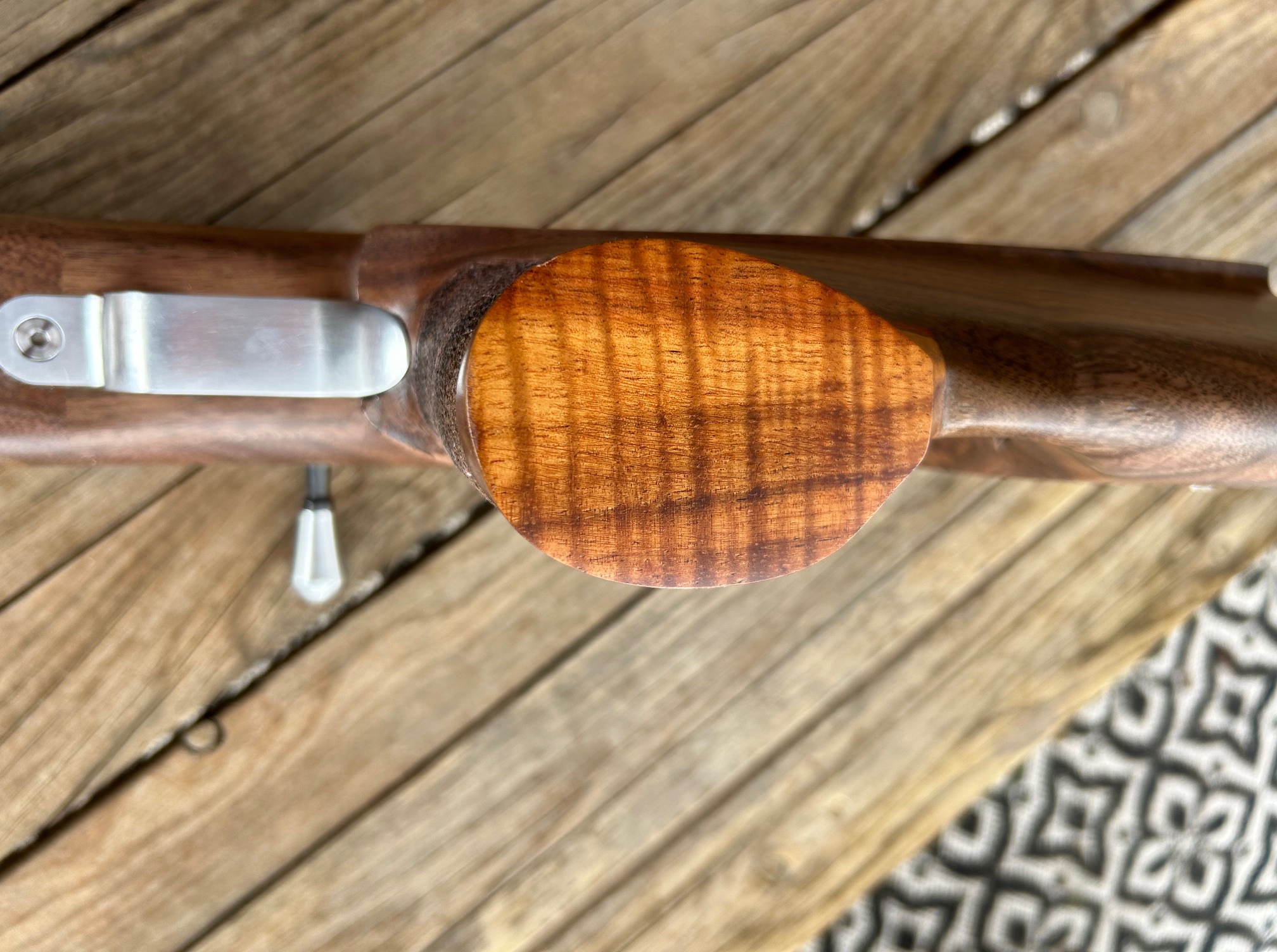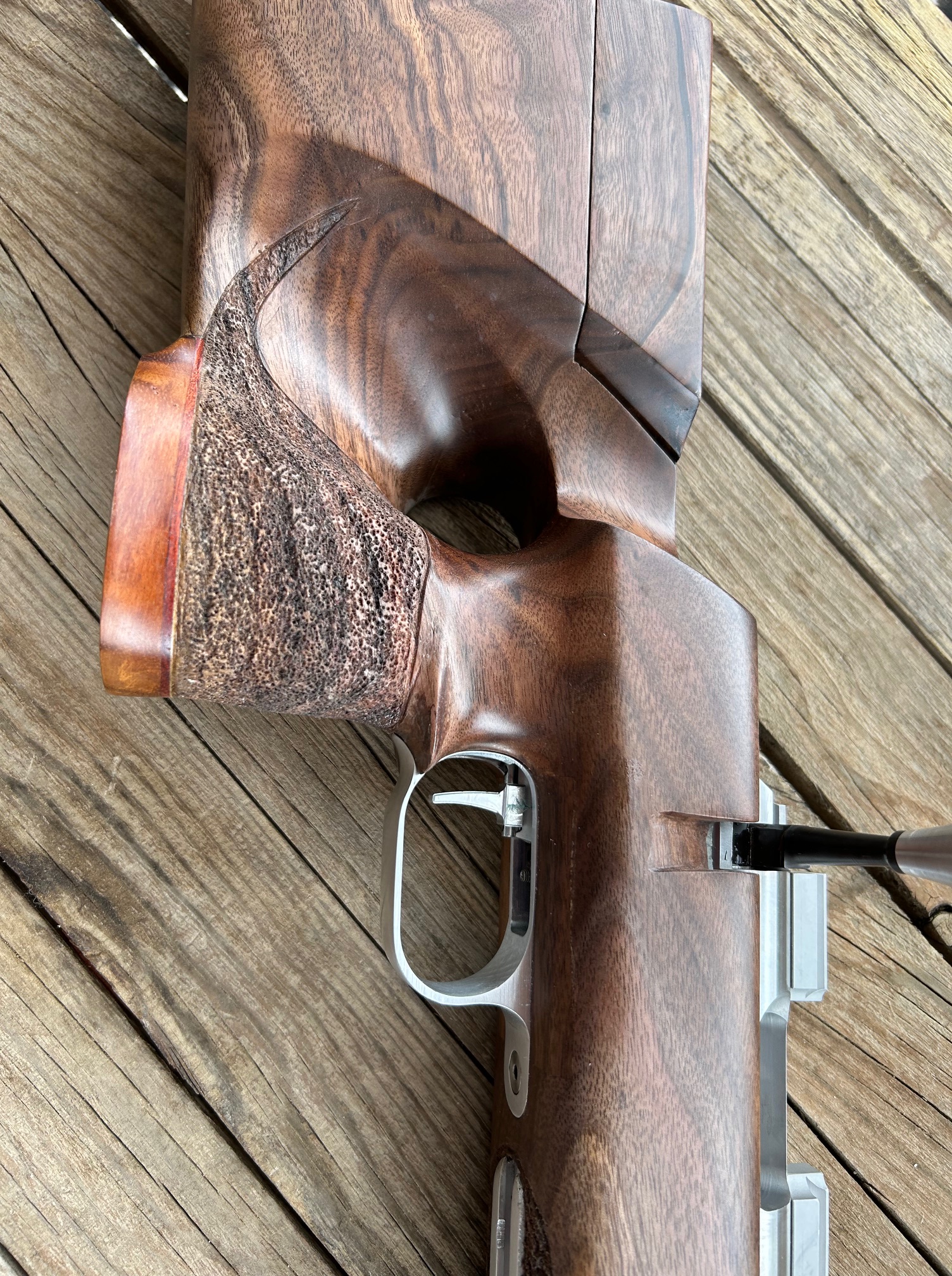 Modified the buttplate, so that it could be used on this stock. Made the trigger guard. Stock is American Walnut. Pistol grip cap is Koa. Thumbhole stocks aren’t the easiest to work on, but they sure are pretty.