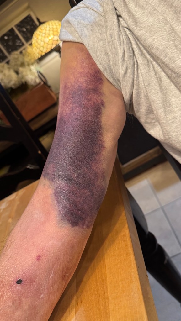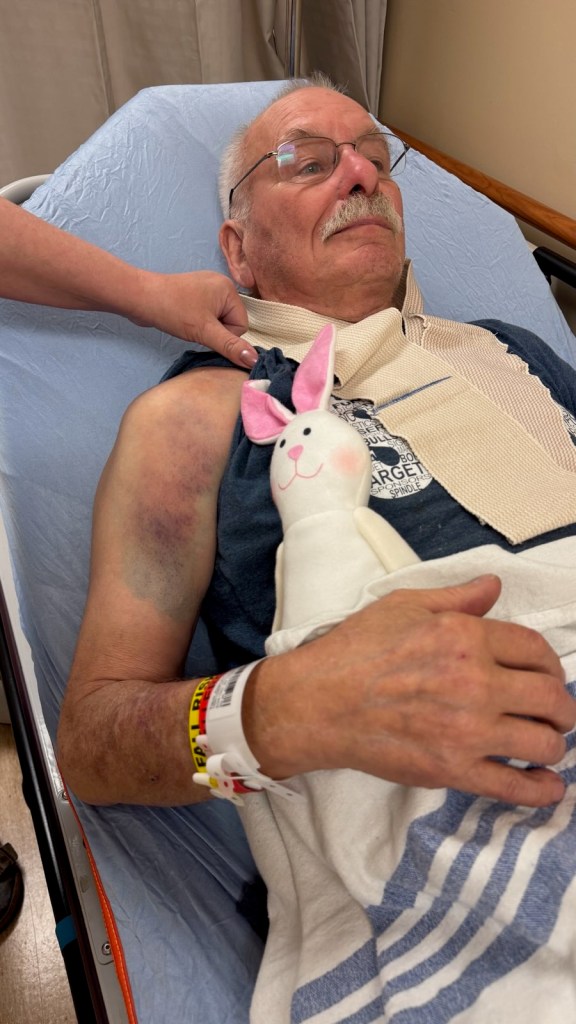 Dad is okay-ish. Monday he was carrying mulch. Monday night he said his shoulder was a wee bit sore. Tuesday he was in the ER. Yesterday, he was released from the hospital. He tore his full thickness rotator cuff. He’s a little slowed down. Work will take a bit longer to get done, as he learns to use his left arm a bit more. As usual, he trying not letting this slow him down too much. Right now, he’s out cooking bacon on the grill (in a frying pan). All in all, he doesn’t want anyone to worry, just letting folks know he’s fine, but things are slowed down for a few weeks.