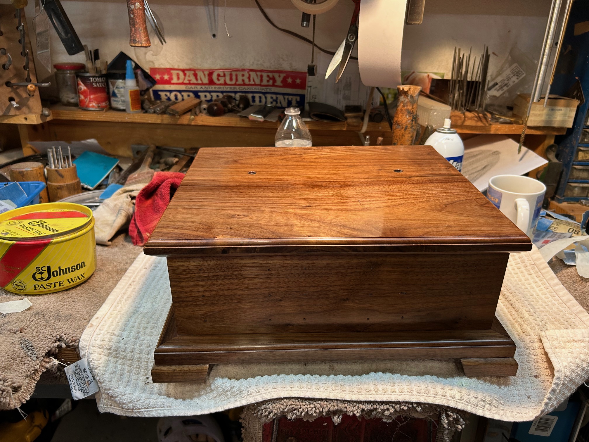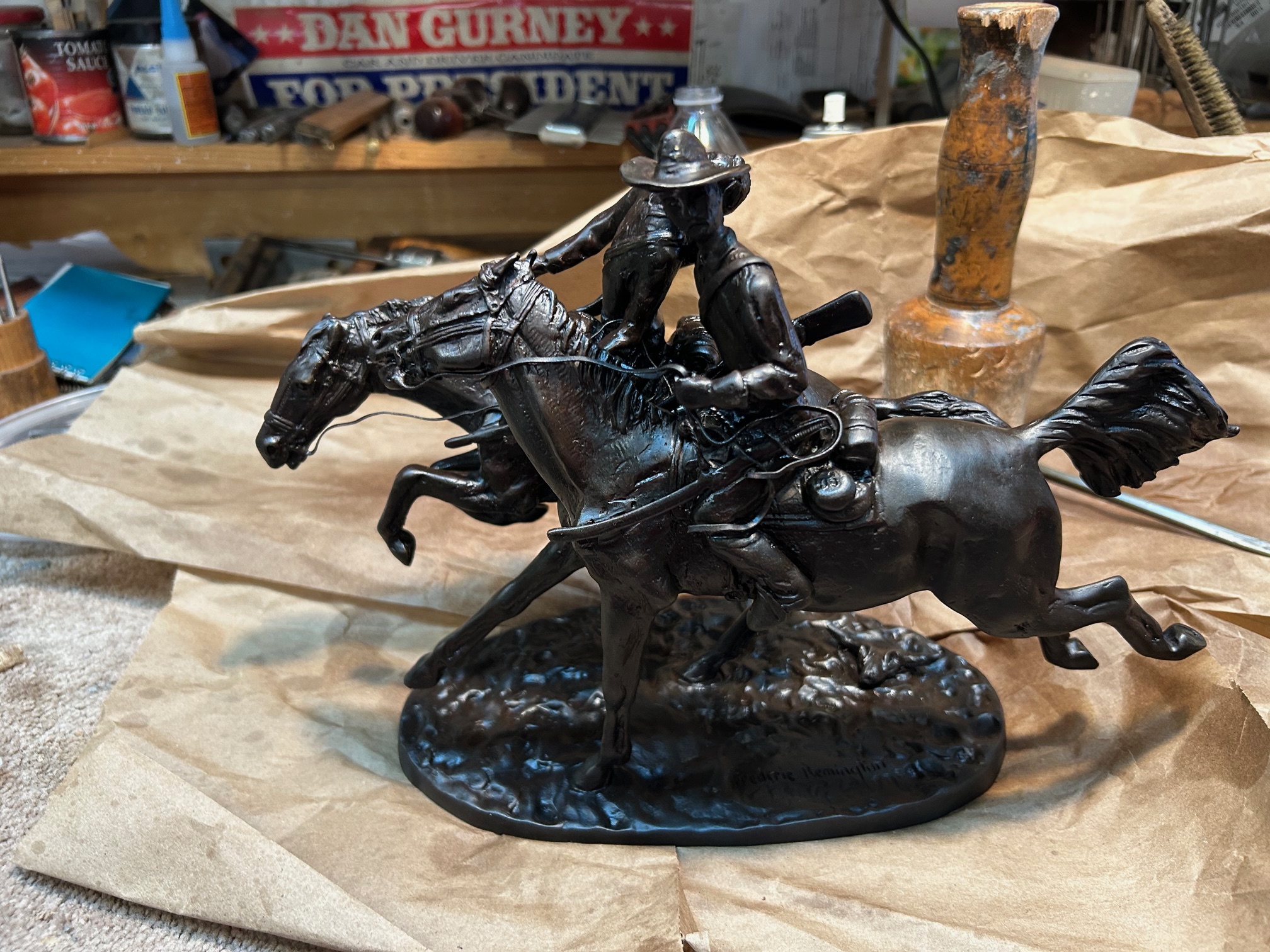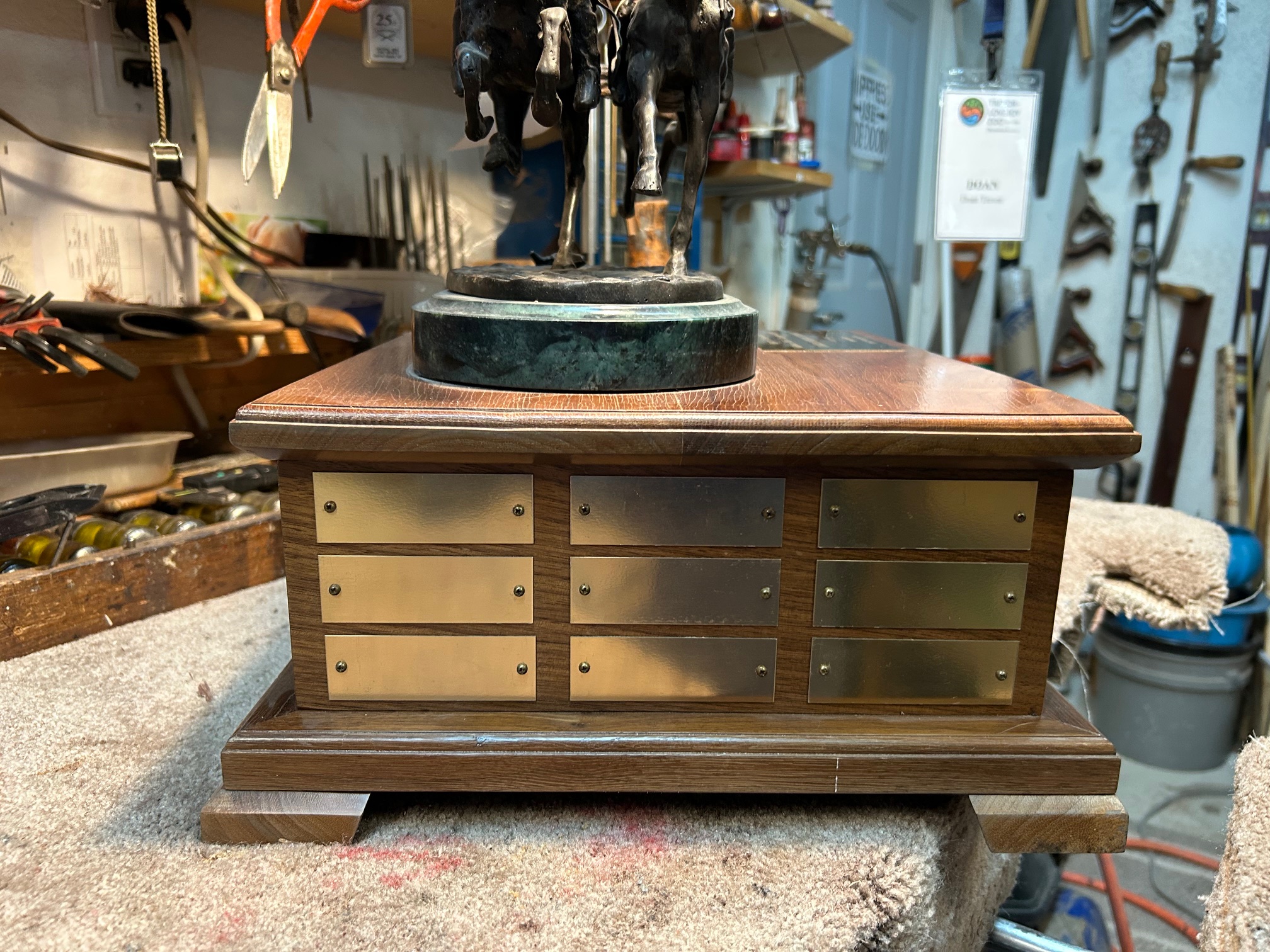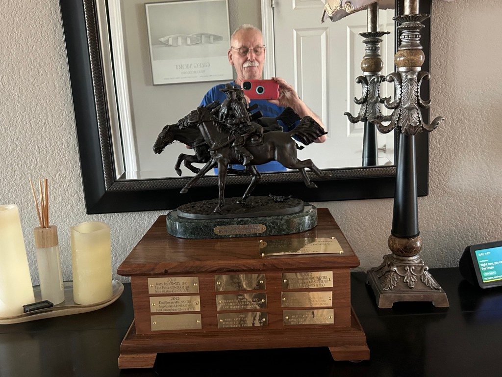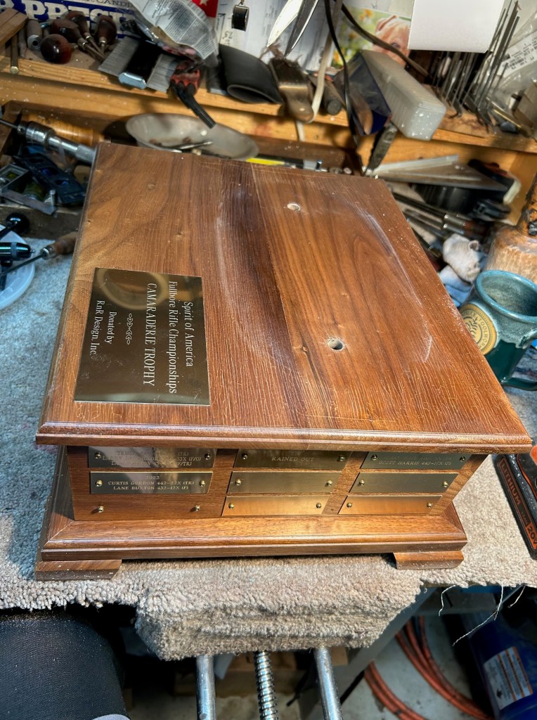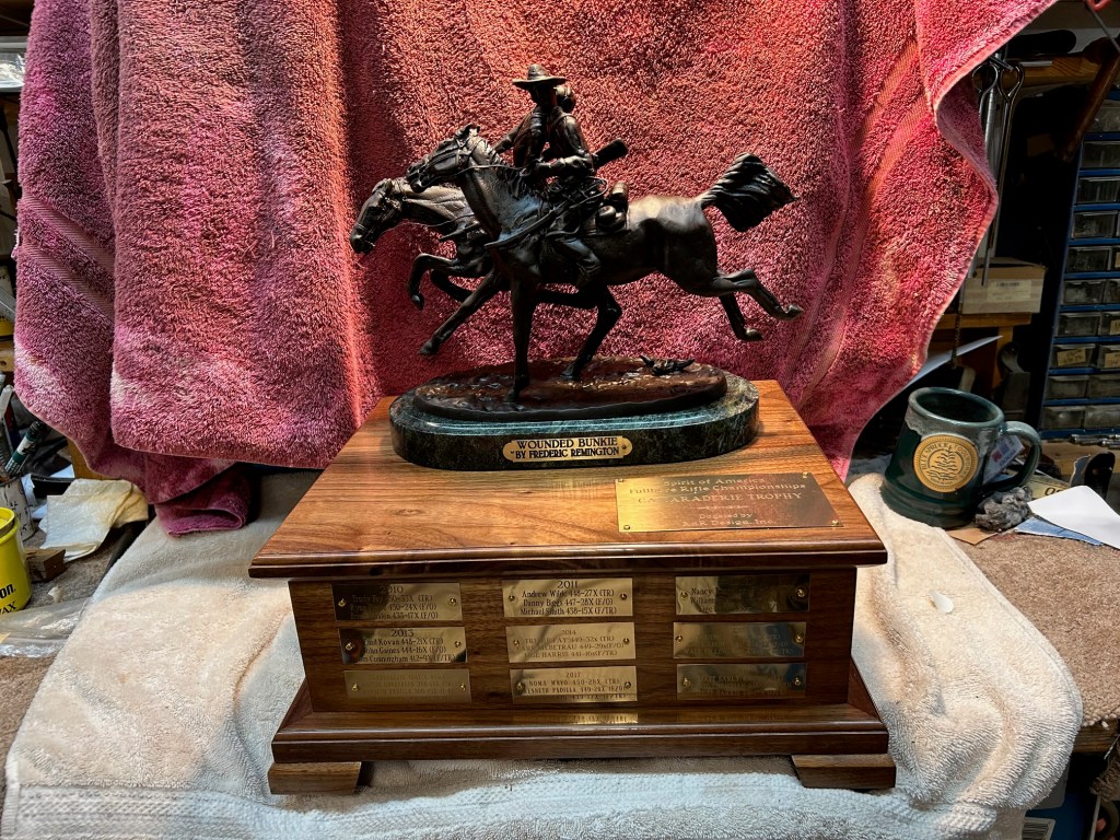 This is the Camaraderie Trophy for SOA Match, it was donated by Scott Riles in about 2010. It had severe water damage. I’ve been working on restoring a few of this trophies over the last few years. It has been keeping anyone that has stayed over in our guest room company. Clare, for one, will miss it being there.