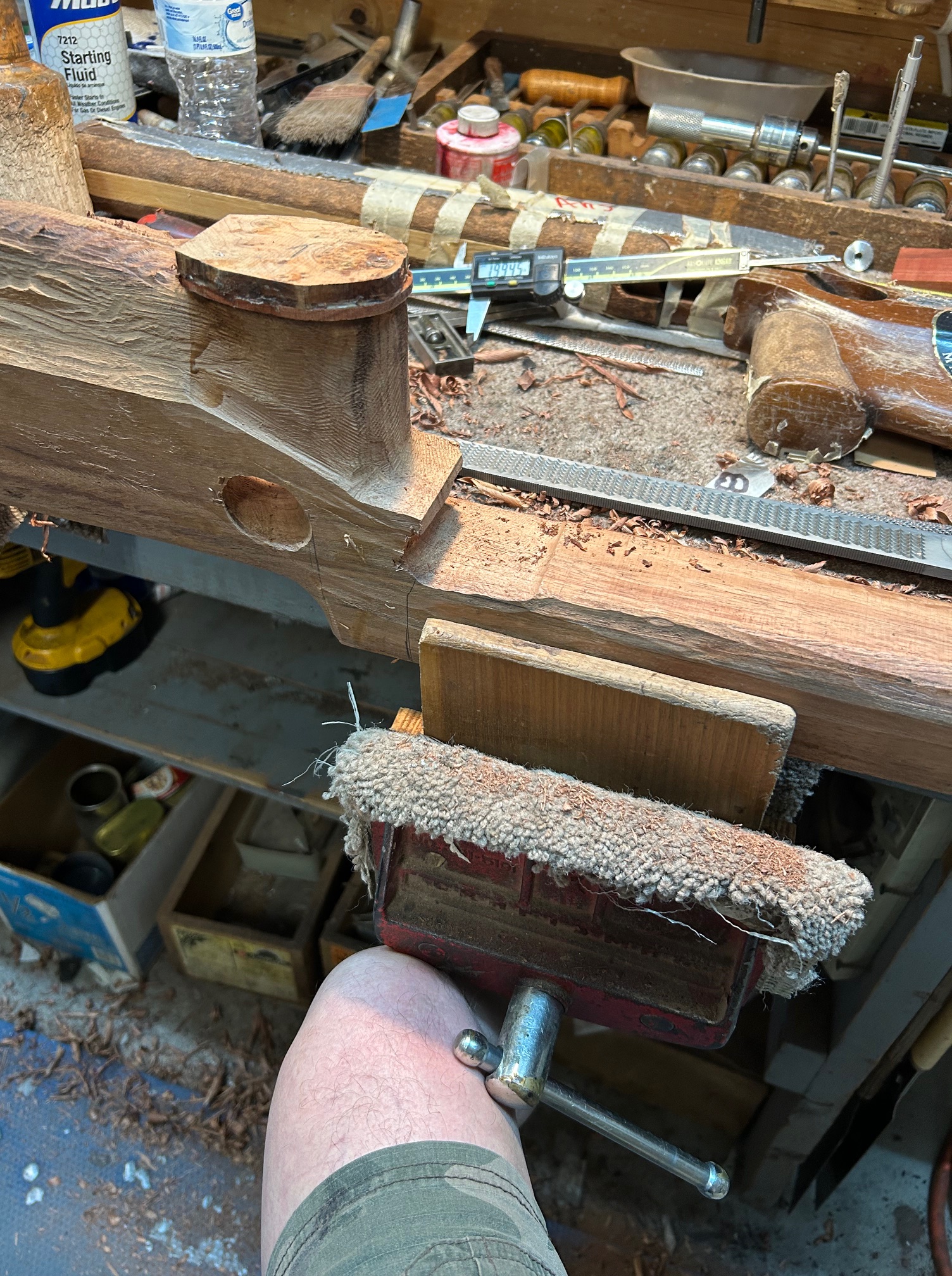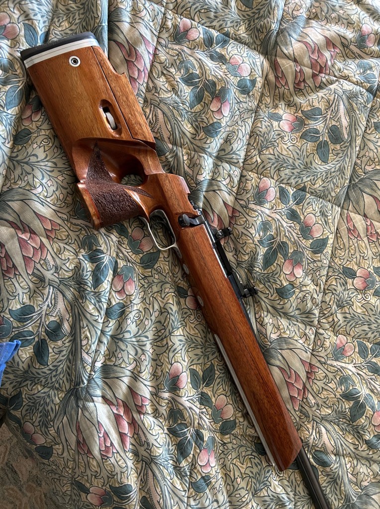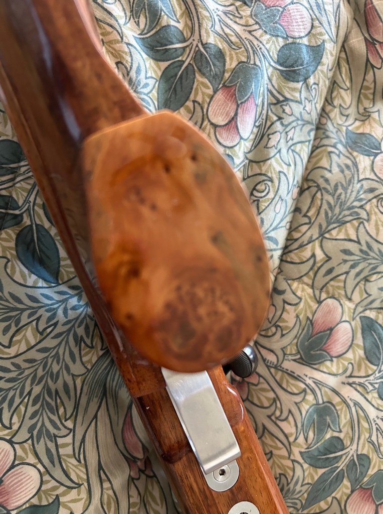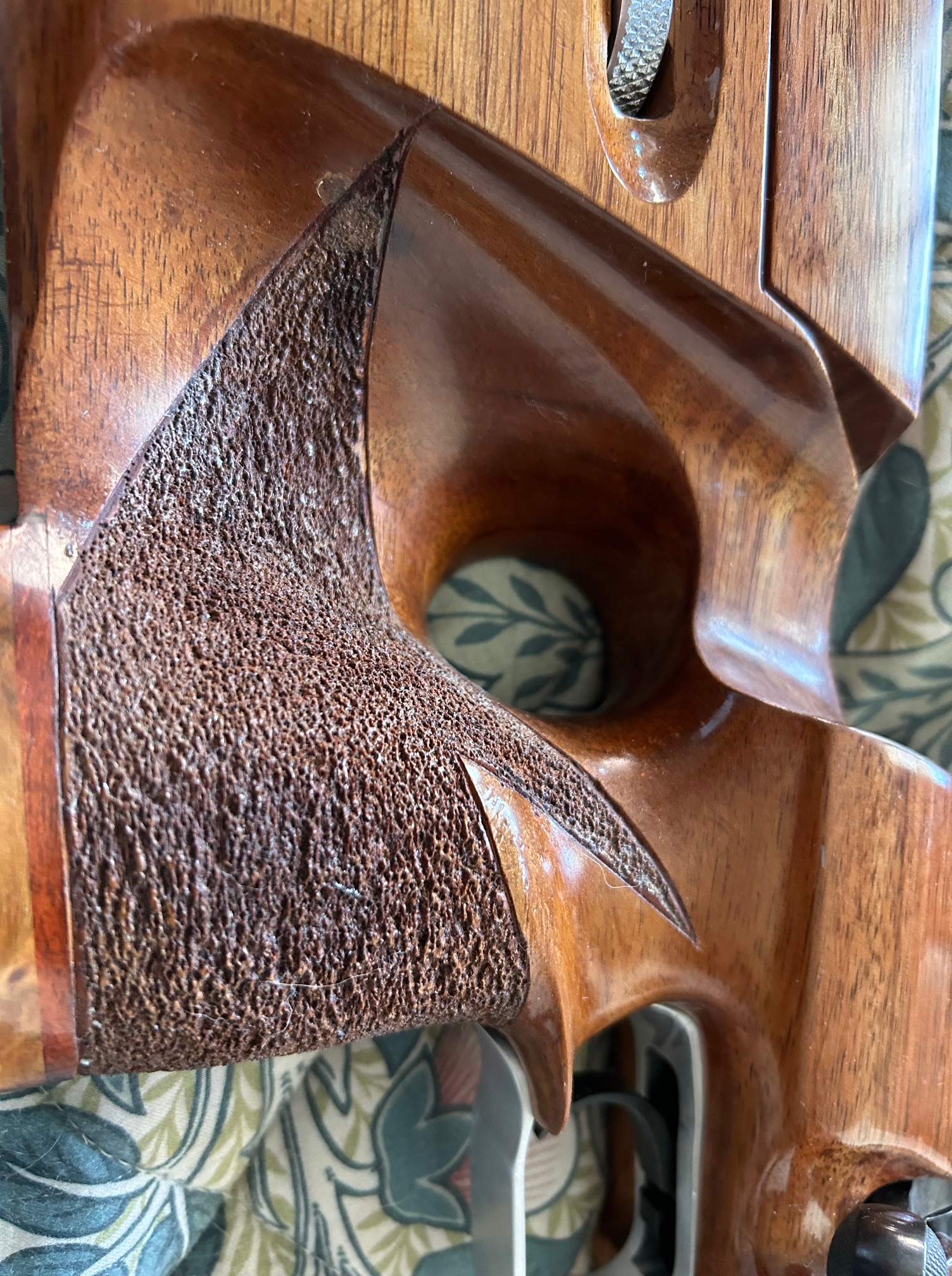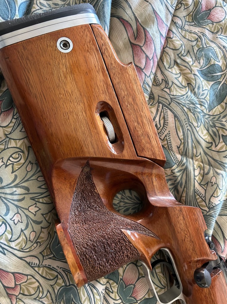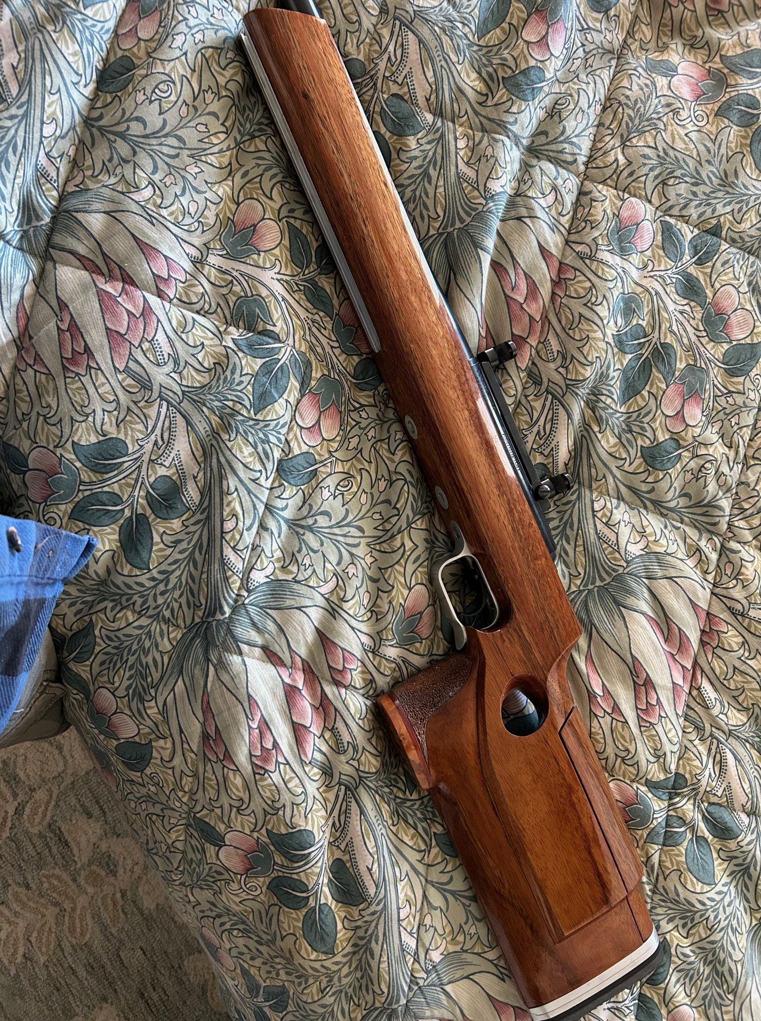 Years ago at Camp Perry, I met quite a few people that lived in Hawaii. They introduced me to Koa Wood. I made a full Koa stock for one of them. You can not cut a Koa tree down for wood, but you can forage for downed trees. One of theses guys set me up with a place I could get Koa at a reasonable price. This is the last full piece I had. I have pieces left to make a couple laminate stocks mixed with other woods. Thumbhole stocks are a bit more difficult on the body to make. I complete understand why Anschutz no longer makes them. The pistil cap is Thuya wood (someone took an out of focus picture, good thing his woodworking skills are better).