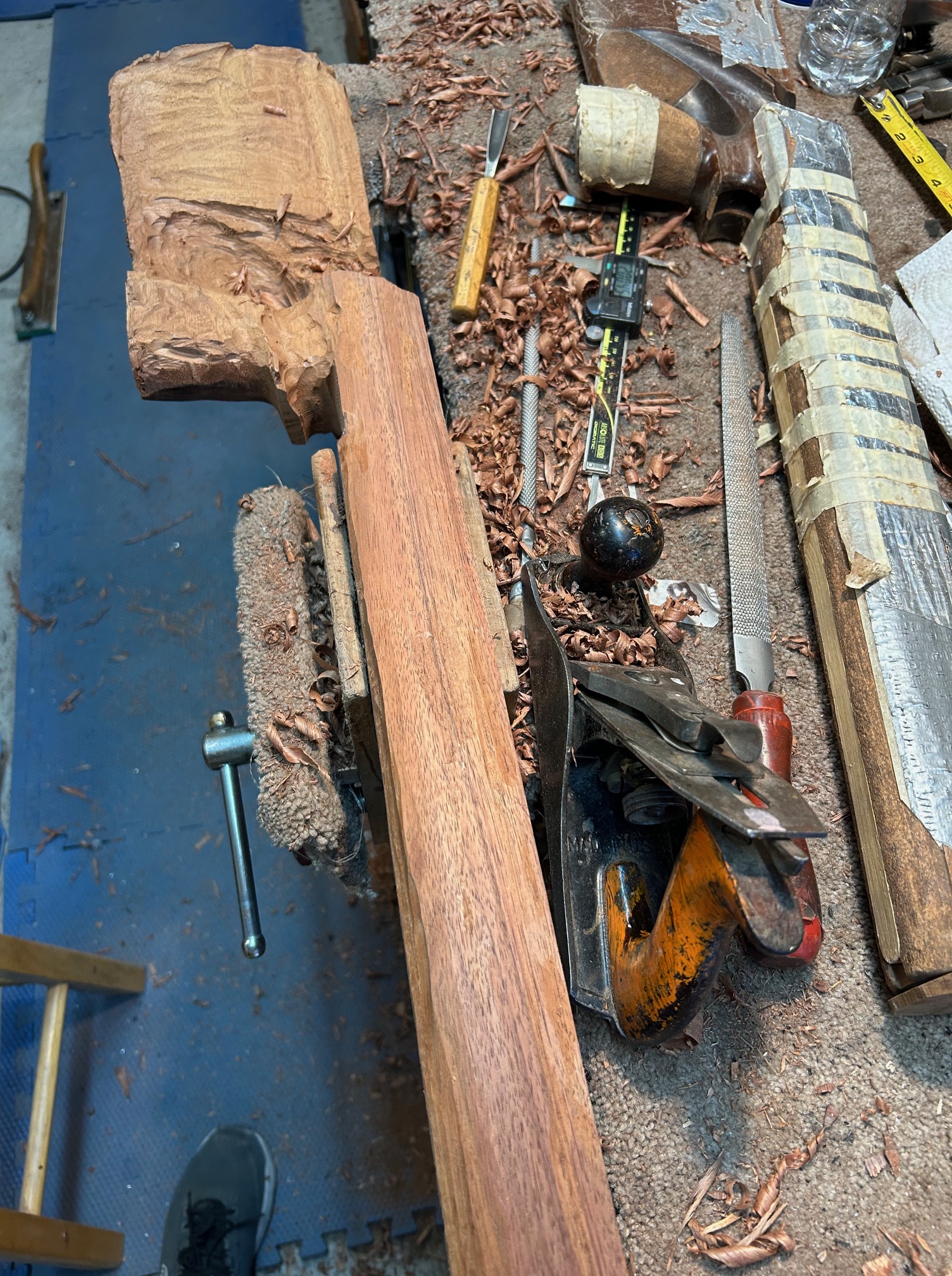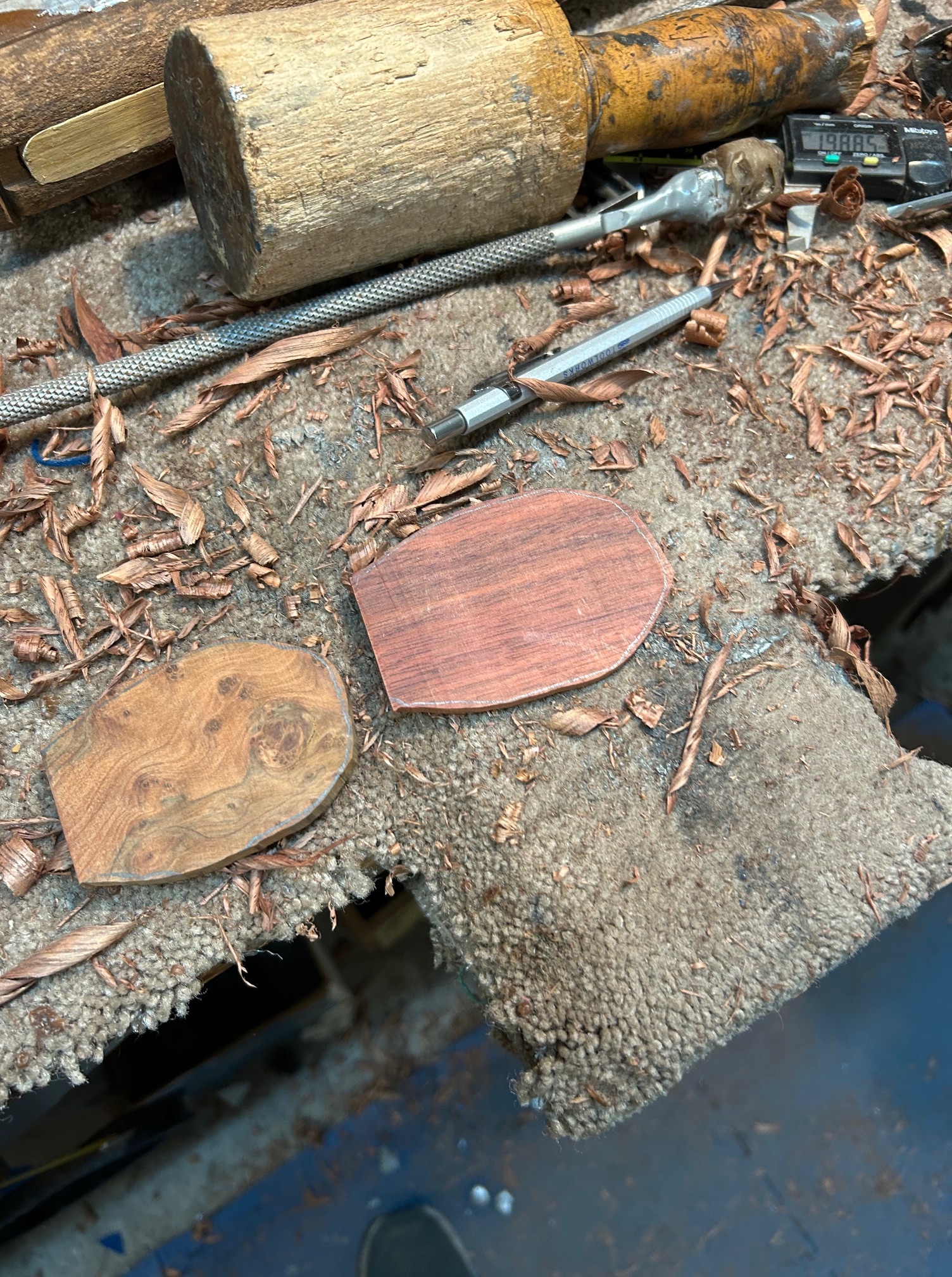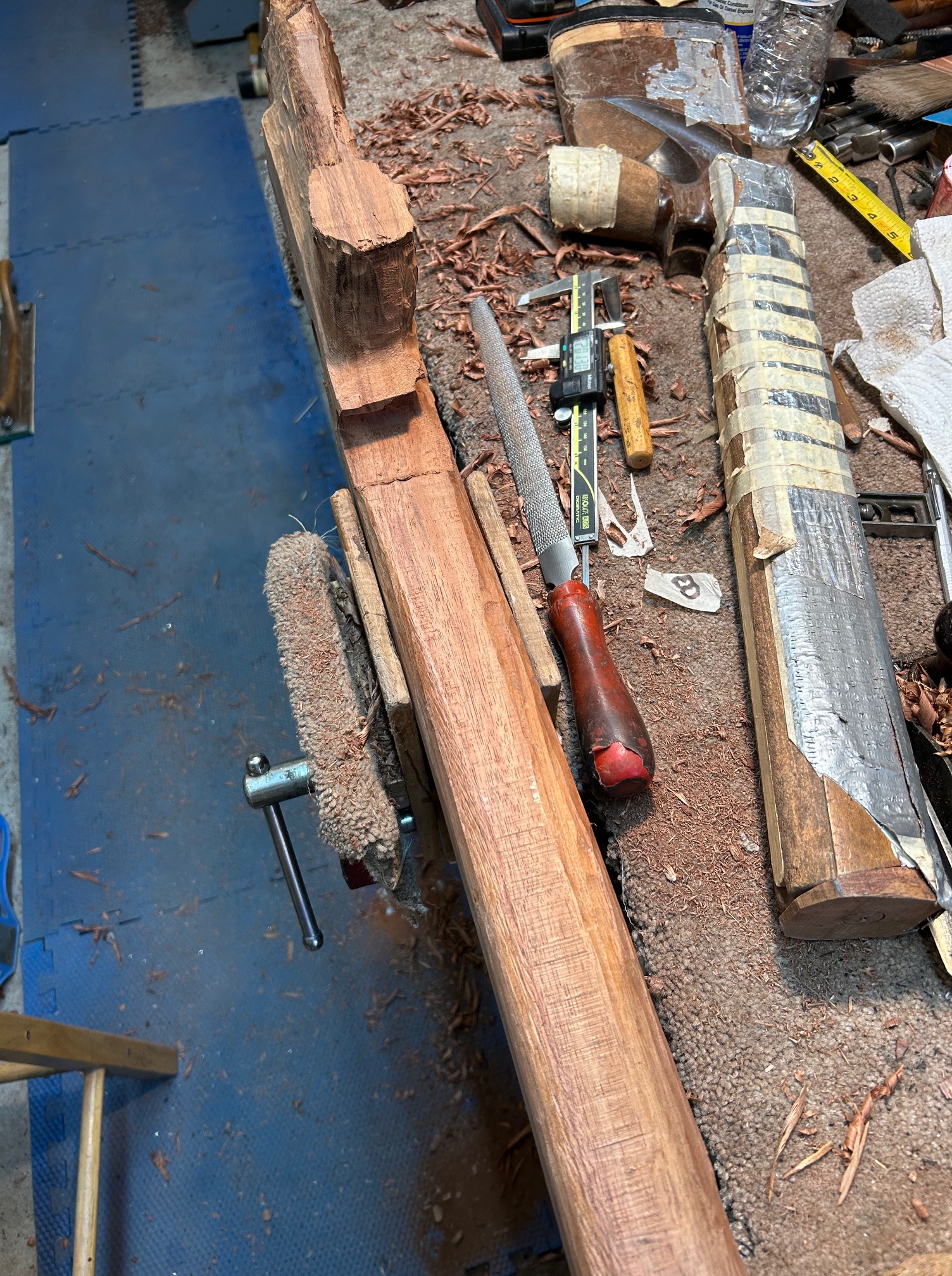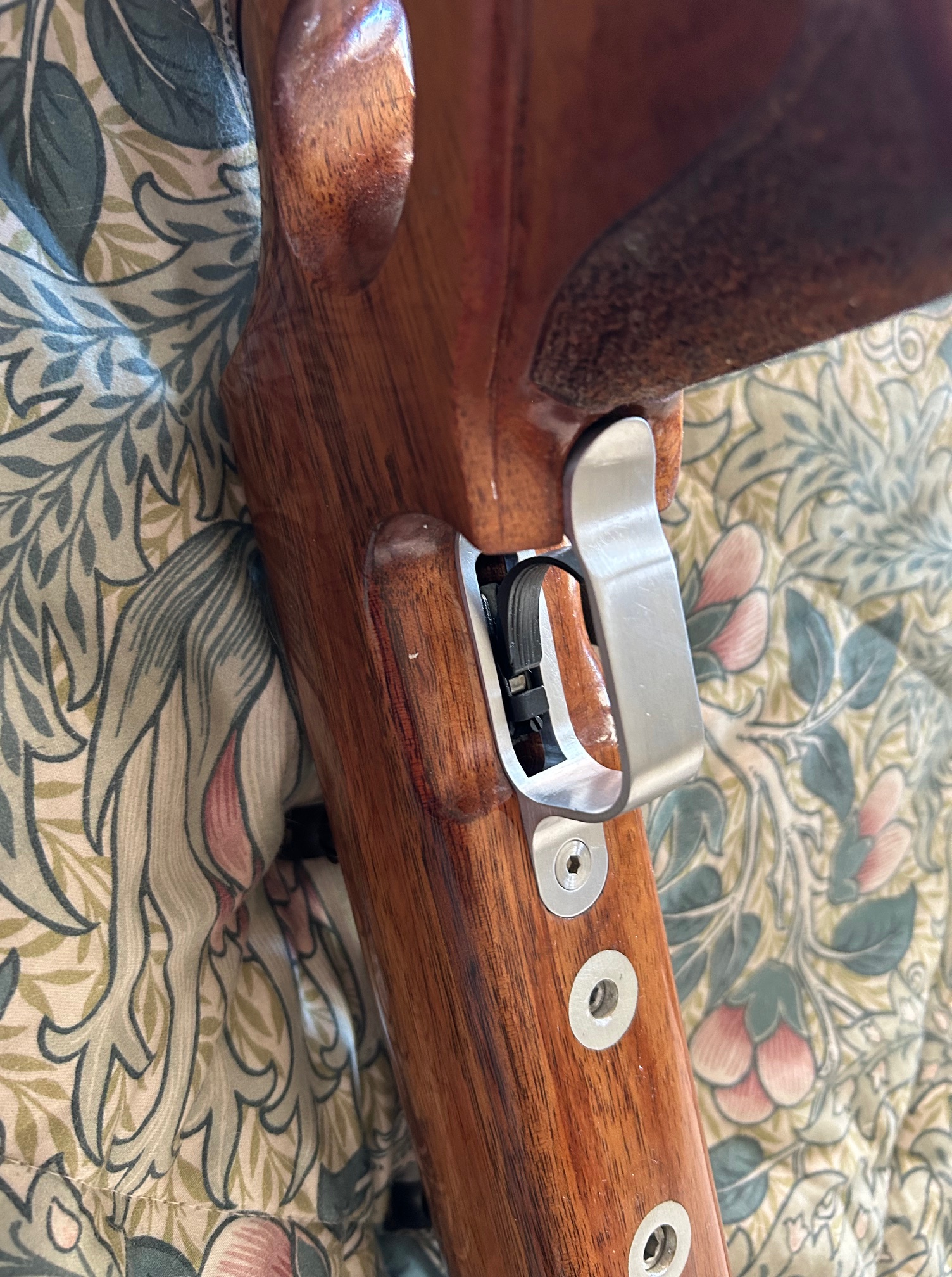 Years ago at Camp Perry, I met quite a few people that lived in Hawaii. They introduced me to Koa Wood. I made a full Koa stock for one of them. You can not cut a Koa tree down for wood, but you can forage for downed trees. One of theses guys set me up with a place I could get Koa at a reasonable price. This is the last full piece I had. I have pieces left to make a couple laminate stocks mixed with other woods. Thumbhole stocks are a bit more difficult on the body to make. I complete understand why Anschutz no longer makes them. The pistil cap is Thuya wood (someone took an out of focus picture, good thing his woodworking skills are better).