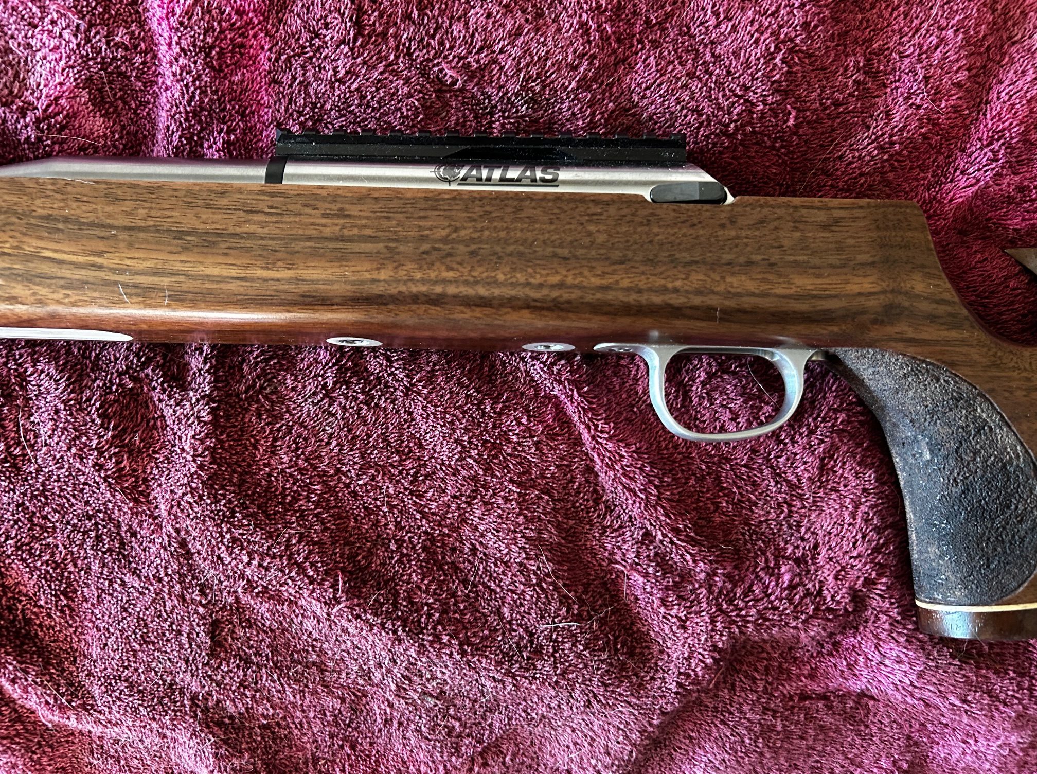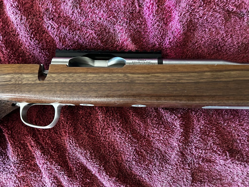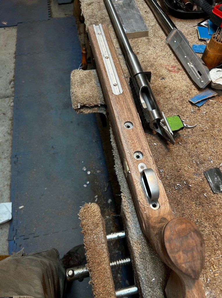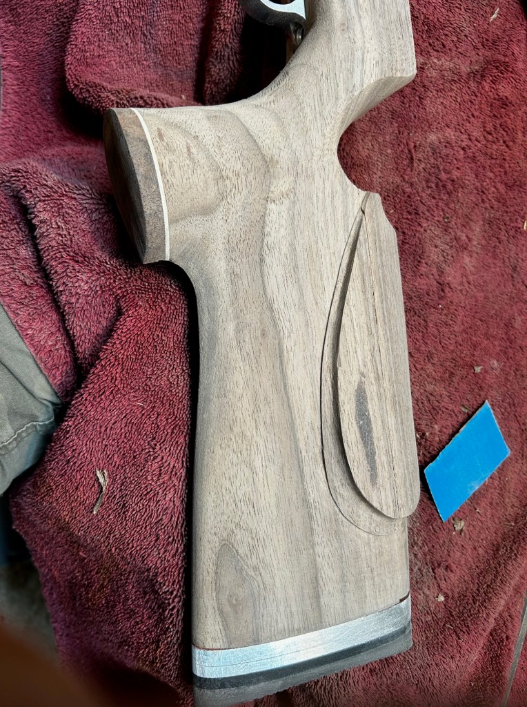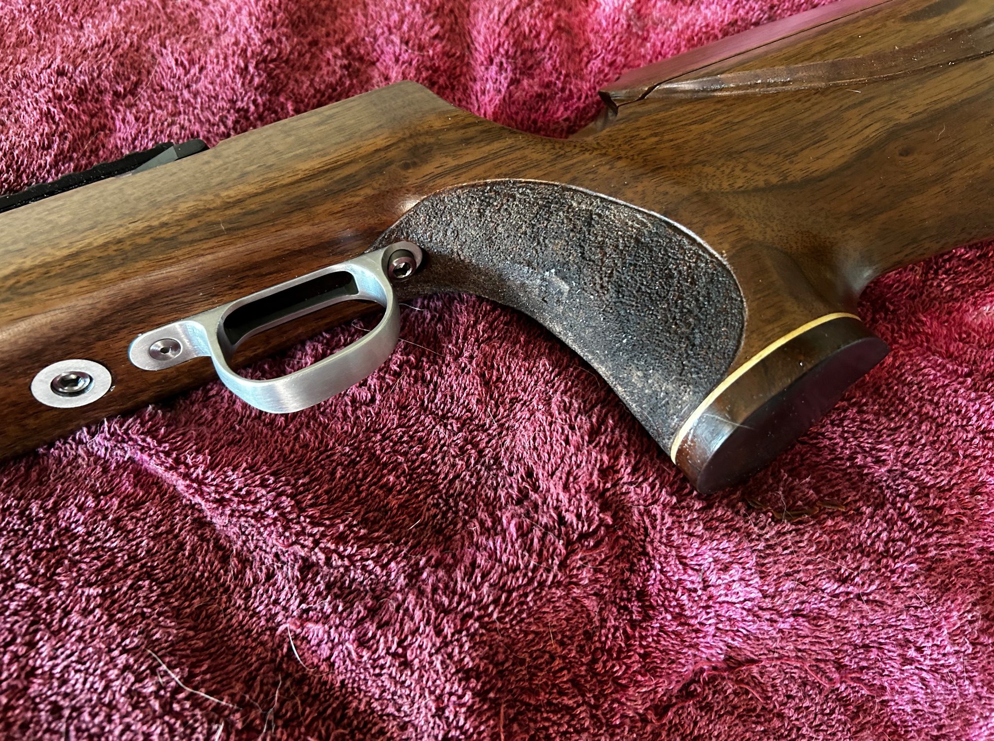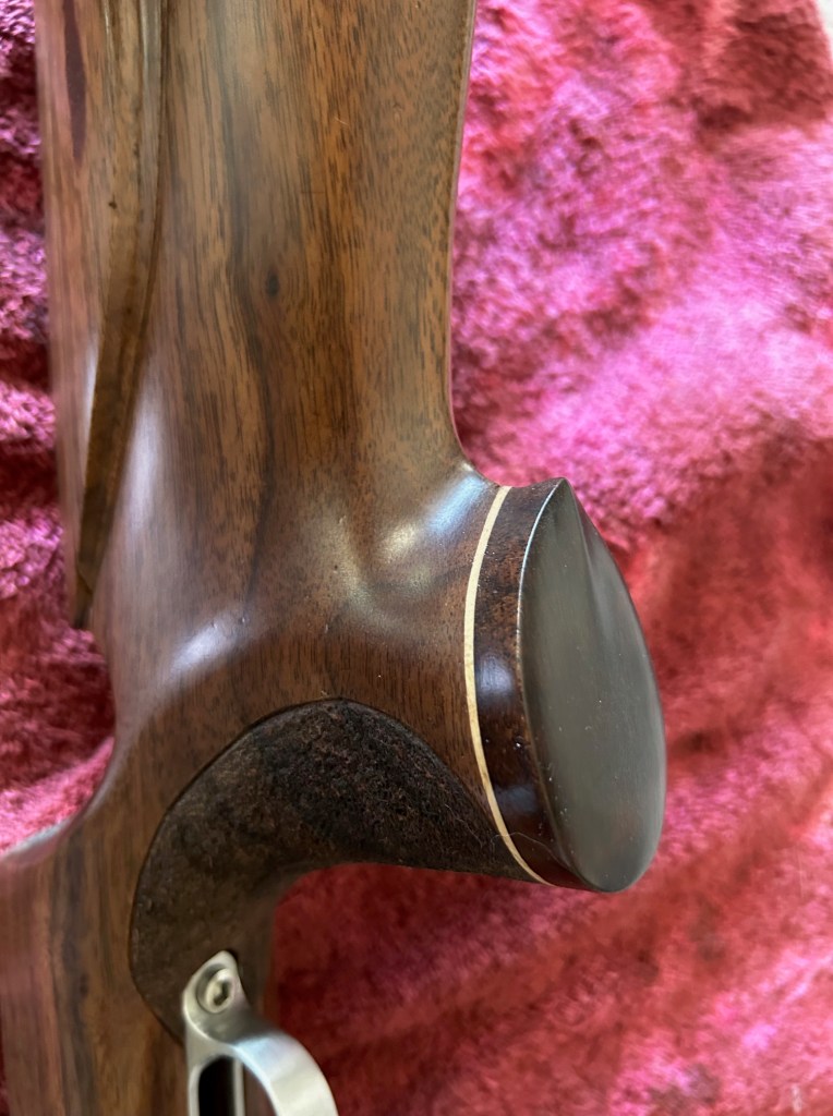 This is a .223 caliber barreled by 10x Engineering. The walnut is nicely grain with mineral lines. Pistol grip cap is a piece of burled Claro Walnut and the white line is a piece of birch.