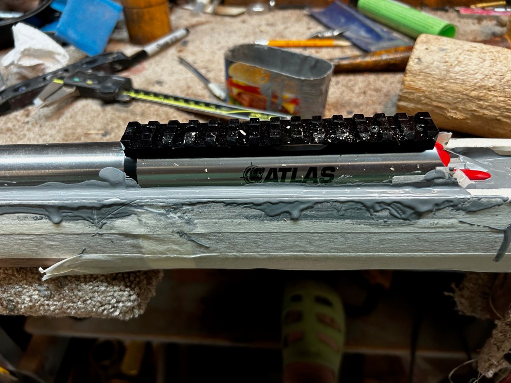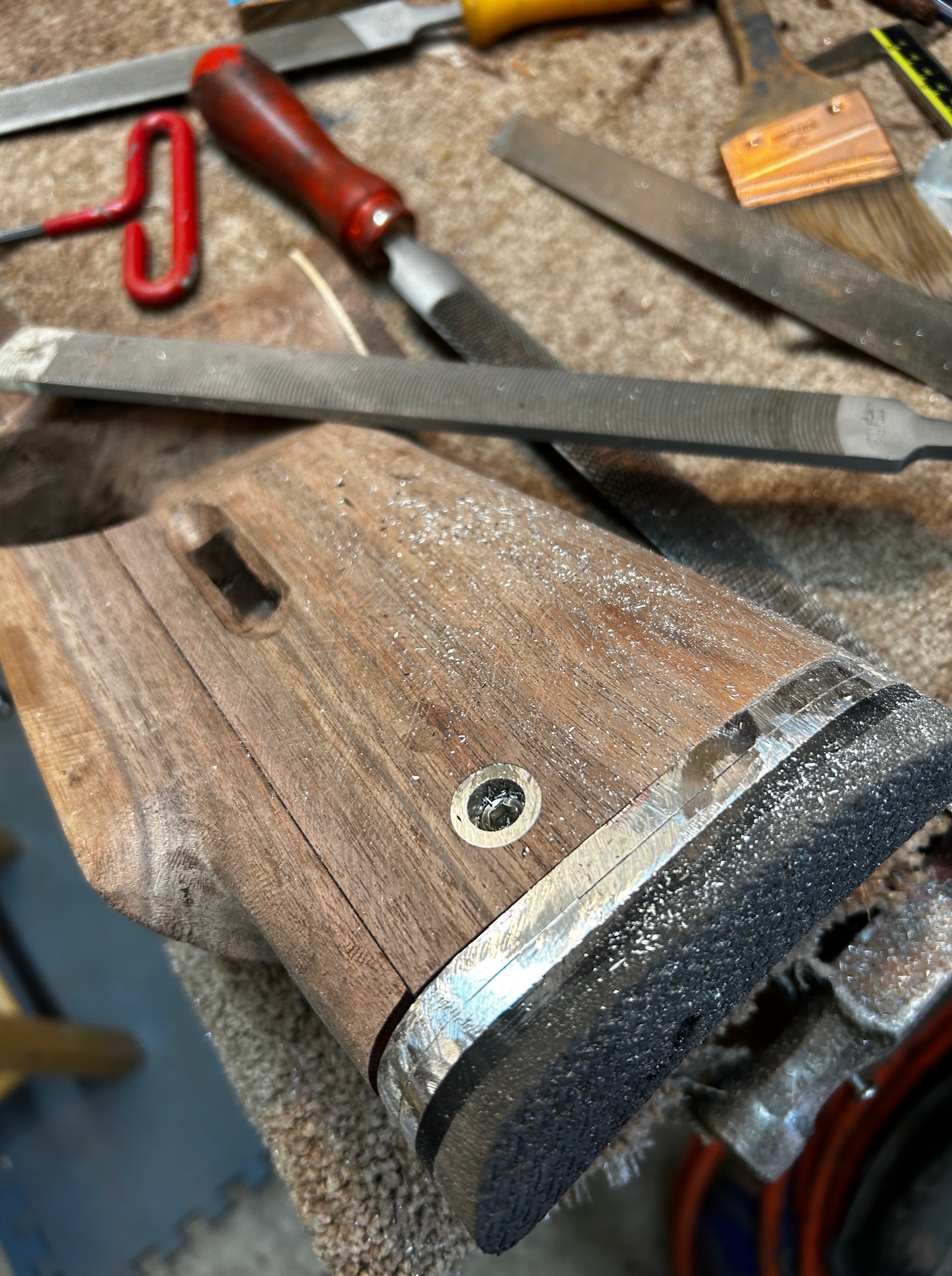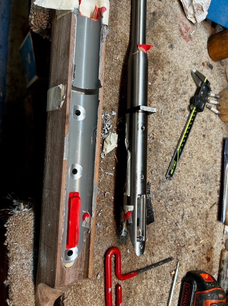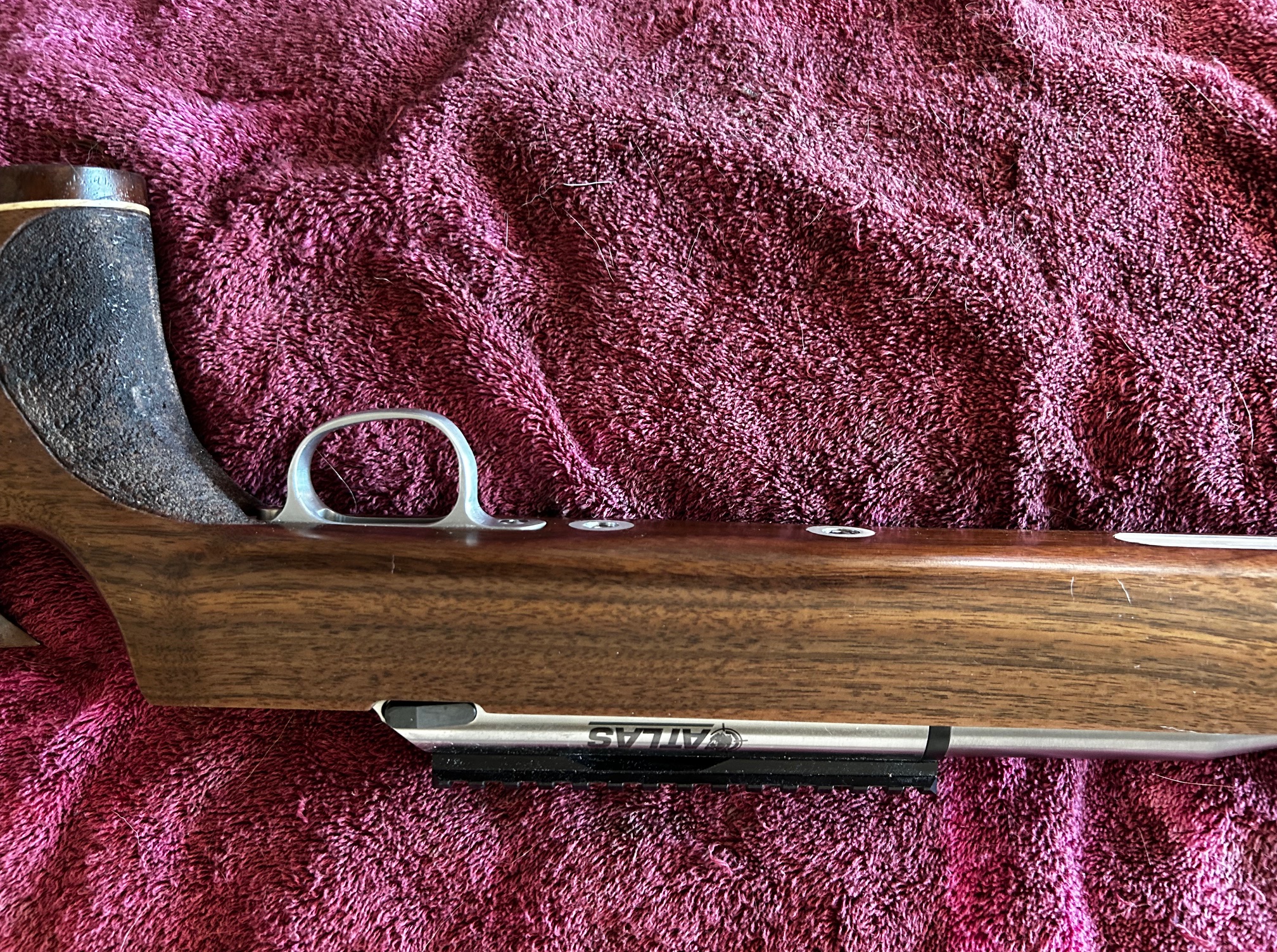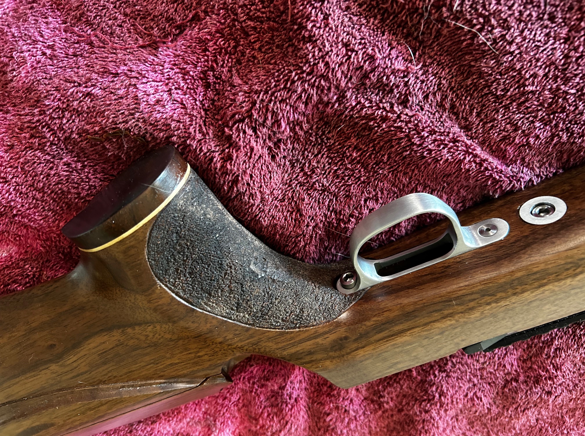 This is a .223 caliber barreled by 10x Engineering. The walnut is nicely grain with mineral lines. Pistol grip cap is a piece of burled Claro Walnut and the white line is a piece of birch.