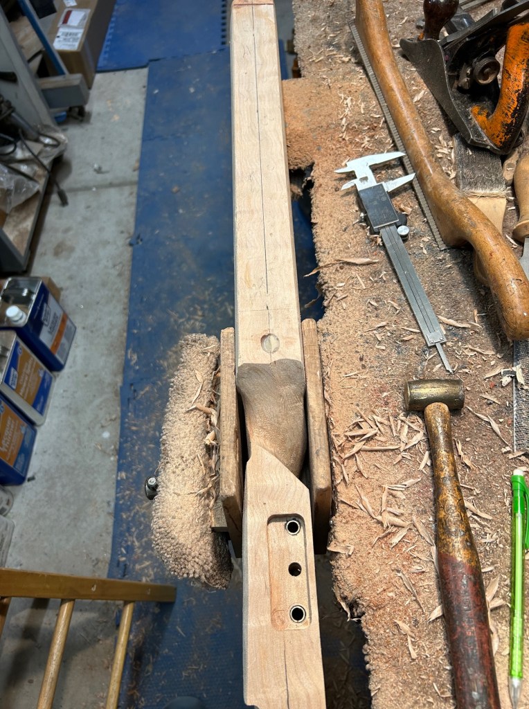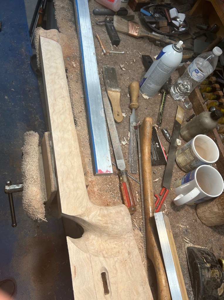 Inletted Mack Brothers action into the stock using three pillars. The stock had a few nicks and dings, refinished it. There was a lot of stain on the original finish. I decided to lean into the natural color of the wood.