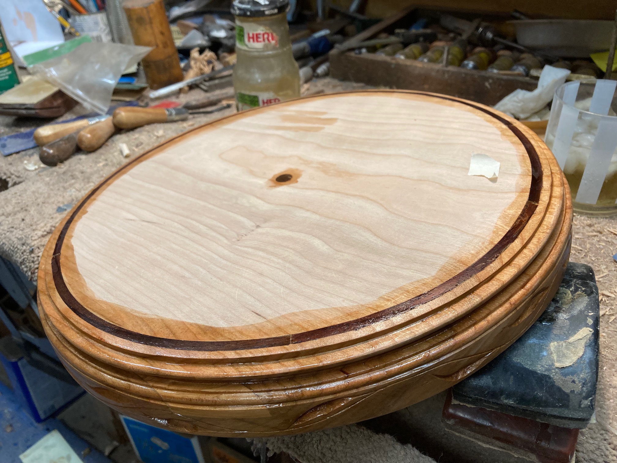 This is one of the more fancy pieces of wood that I’ve worked on in some time. The different in colors in the wood are also different hardnesses. You have to pay attention when sanding on it, so that you don’t create divots.