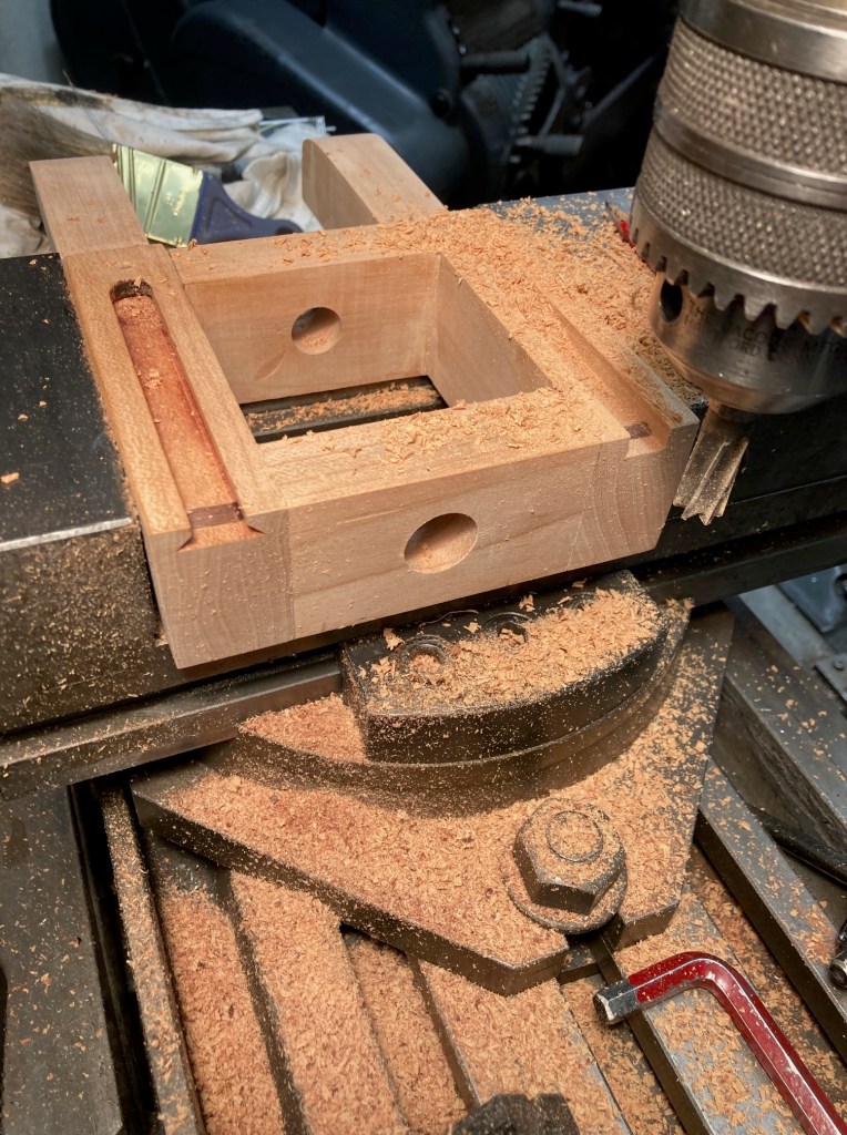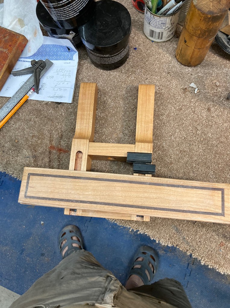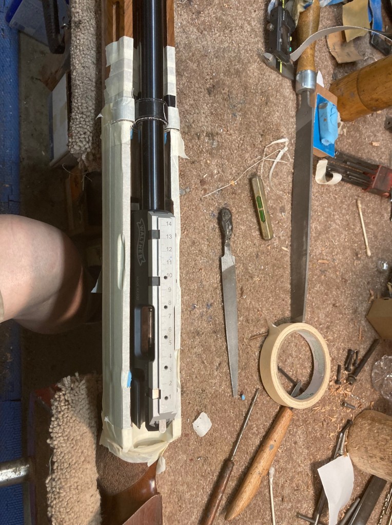 Retrofitting entails putting a rear bag slider at the appropriate angle and finding a piece of wood from my stash aka the scrap pile to put under the stock. The scrap pile has bits of English Walnut, Mango, Koa and Purple Heart… nothing goes to waste.