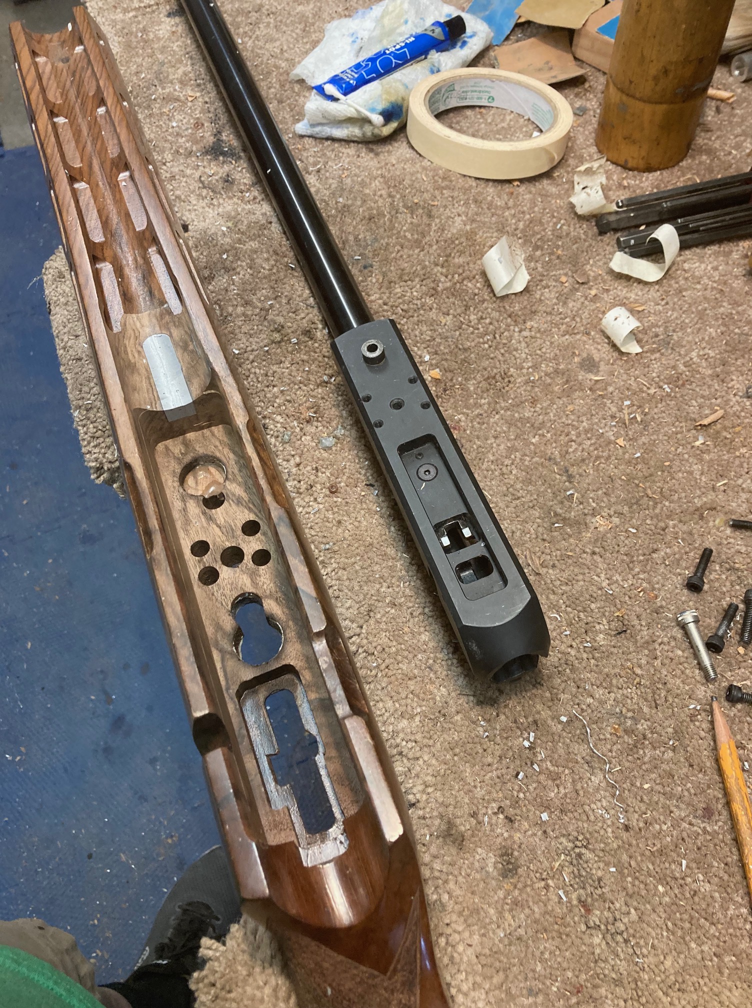 Fortner Action are a little different to work with. You have to put a magazine well in the magazines with fit into the bottom of the stock. The trigger guard has to be fitted at an angle.