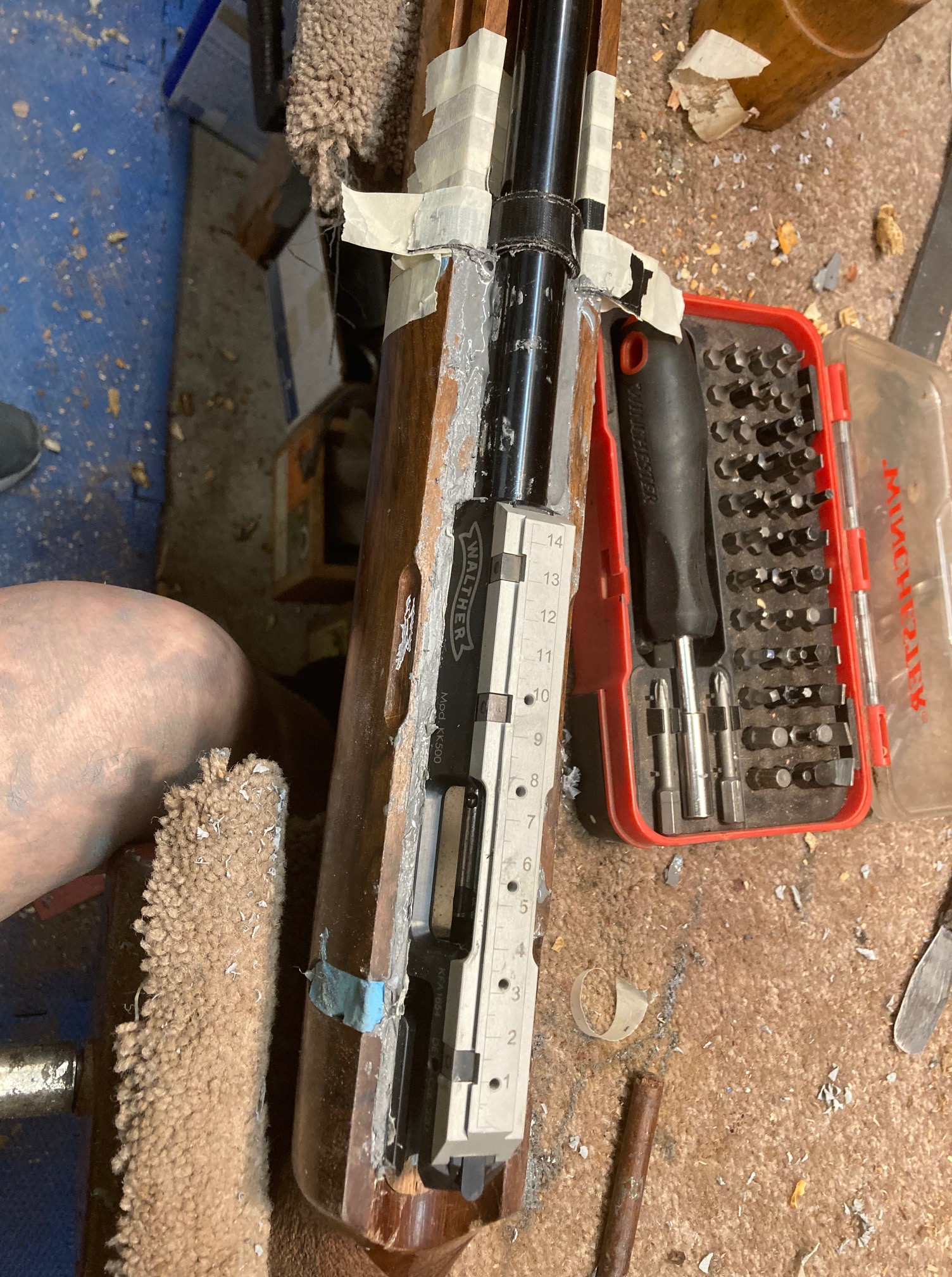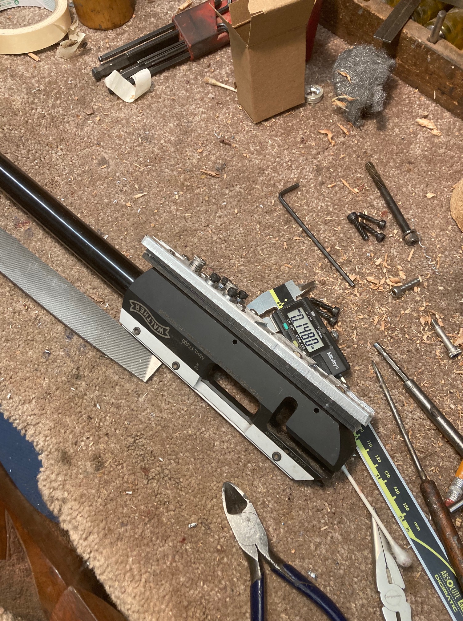 Retrofitting entails putting a rear bag slider at the appropriate angle and finding a piece of wood from my stash aka the scrap pile to put under the stock. The scrap pile has bits of English Walnut, Mango, Koa and Purple Heart… nothing goes to waste.