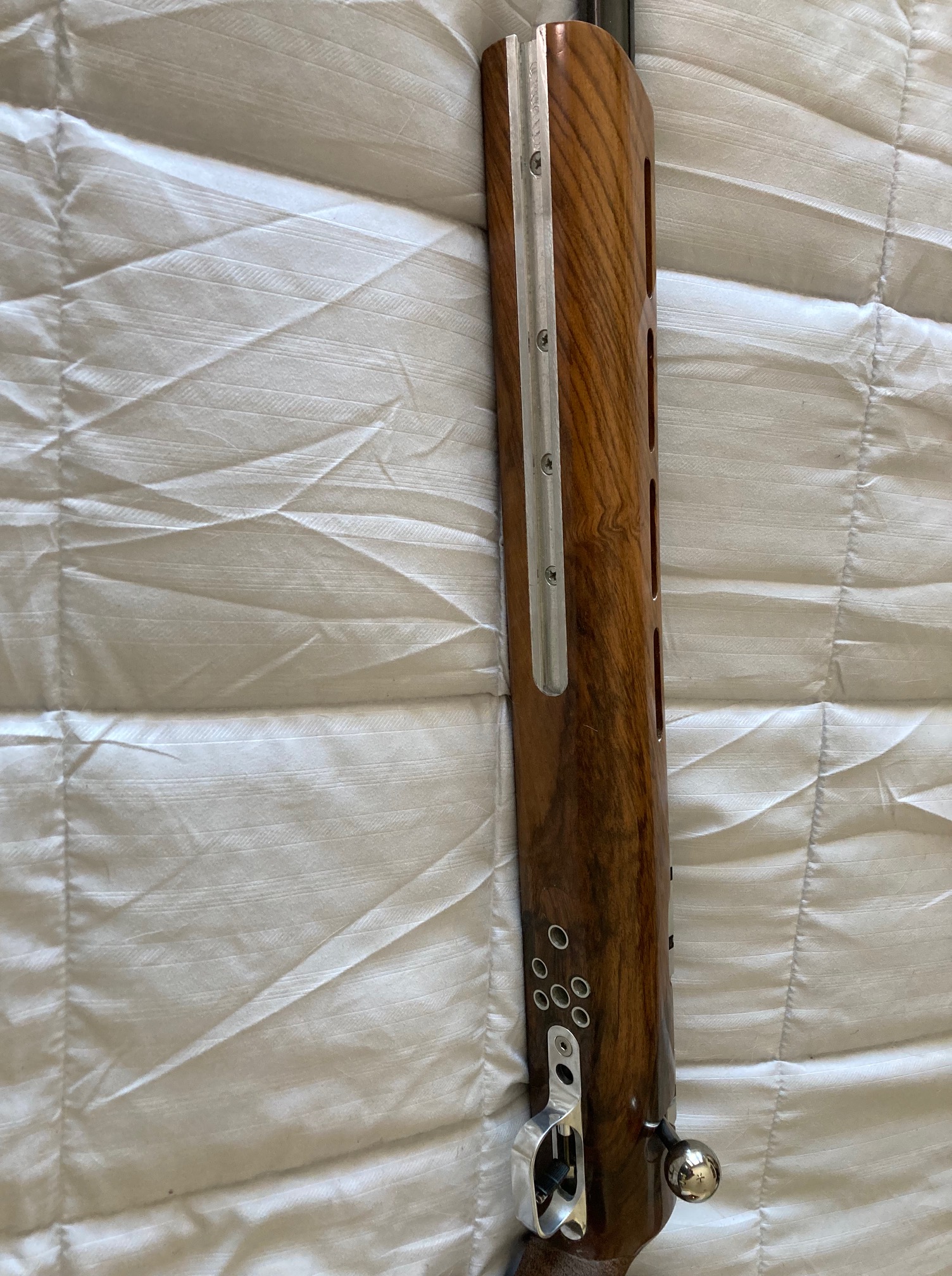 Here is Jim Murphy’s rifle. It’s a Vudoo Action with a fiberglass stock. I reclaimed the stock as it was bedded for 2000 Anschutz. Filled in the bedding and then pillar bedded the Vudoo. Also, I cleaned up the finish and resprayed it.